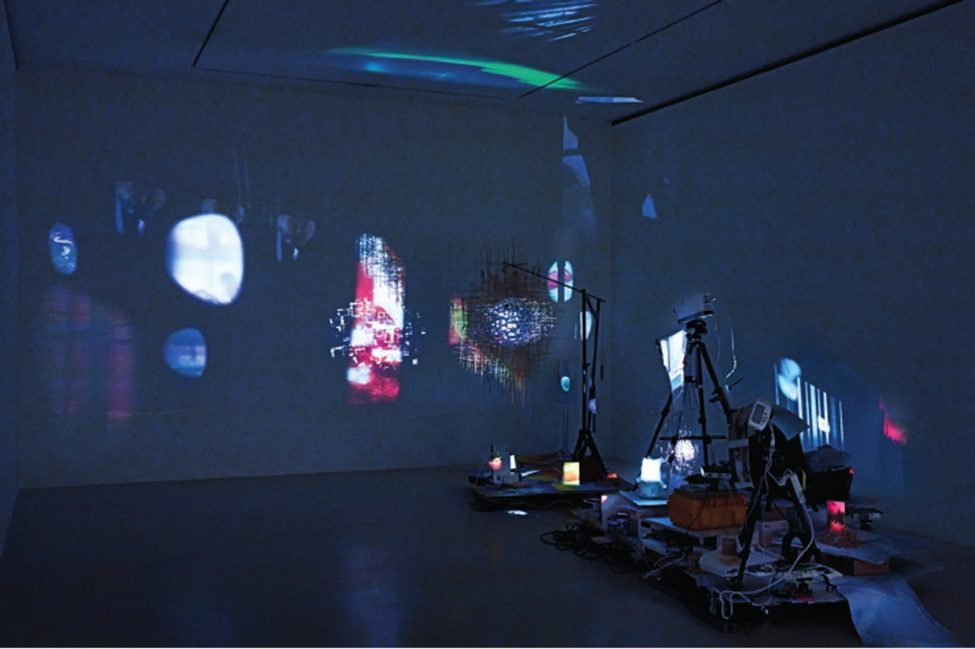 Vos installations sont comme des lanternes magiques : des dispositifs qui projettent des images sur les murs et jusqu’au plafond. Cela évoque à la fois des planétariums et les jeux d’enfants qui consistent à faire avec les mains des animaux en ombres chinoises –d’ailleurs, une des petites vidéos de l’installation en montre un exemple. Là aussi, il y a un phénomène de reconnaissance, d’apparition magique des images. On se trouve en quelque sorte devant votre propre usine à images !