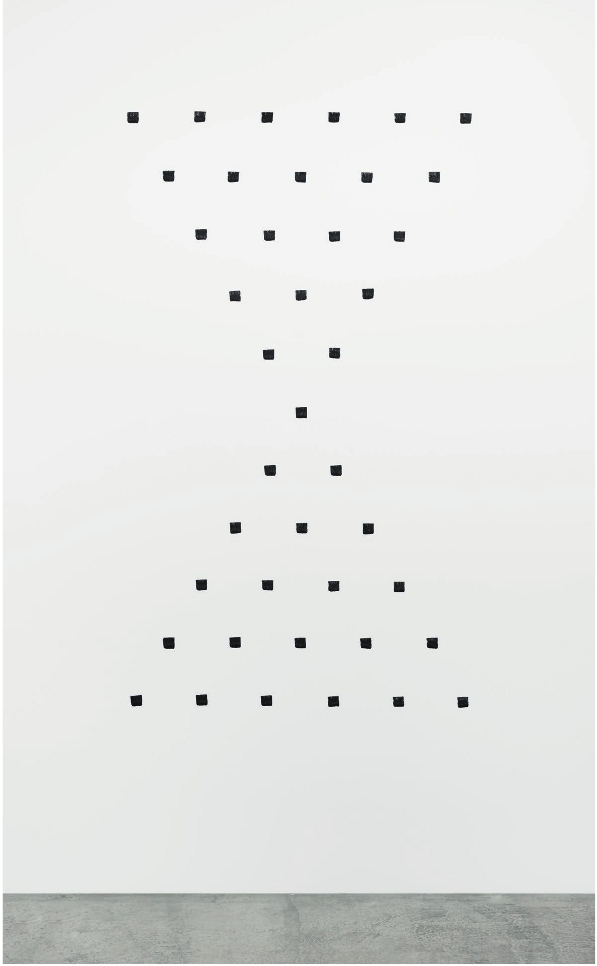 Niele Toroni, Empreintes de pinceau n° 50 à intervalles réguliers de 30 cm, 2016, intervention murale, acrylique noire. Courtesy de l’artiste et Marian Goodman Gallery. Photo Rebecca Fanuele