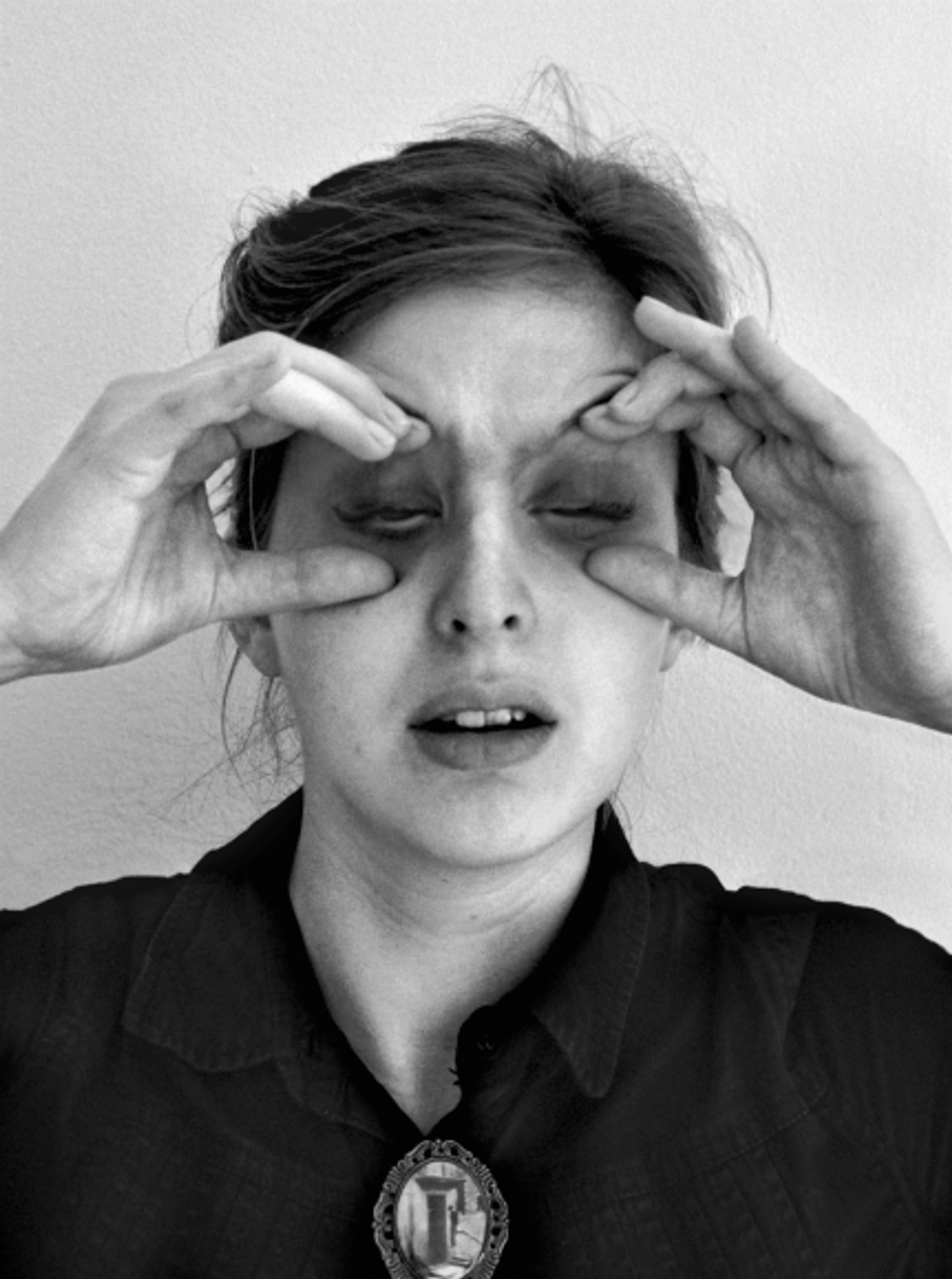 Une photographie de la série des Métamorphoses (2014-2016) est à ce titre particulièrement éclairante. Elle montre une femme les yeux grands fermés, pourrait-on dire : des doigts, elle semble se les écarquiller, comme on fait pour mieux voir, tan-dis que ses paupières restent obstinément closes. A-t-elle le don de voir les yeux fermés ou s’aveugle-t-elle à force d’essayer de voir ? On reconnaîtra volontiers en elle l’état dans lequel les clichés d’Agnès Geoffray nous plongent, entre surconscience et rêve éveillé, clairvoyance, révélation et incompréhension, et le monde qu’elles dessinent, « un monde qui aurait perdu le sommeil » (Marguerite Duras, Détruire, dit-elle, 1969). S’y forme également la question, centrale ici, de la croyance. Si, en rendant sensible aux détails, entre autres par des jeux d’échos et d’associations (dans Sutures, 2014), ces images éveillent en effet les soupçons. Force est de constater que l’on ne peut s’empêcher d’y croire, comme à ces faits divers et autres anecdotes que l’artiste collectionne, au même titre que certains objets de curiosité scientifique ou cer-tainesdonnées historiques. «Reste à savoir ce qu’il faut croire» : la pièce qu’elle a imaginée en 2017 pour un Atelier de création radiophonique, sur France Culture, se concluait sur ces mots. Fin ouverte s’il en est et qui se propage en d’innombrables questions, car quand on sait que la croyance se fabrique et se dirige, qu’est-ce qui, malgré tout ou malgré nous, nous porte à croire encore?