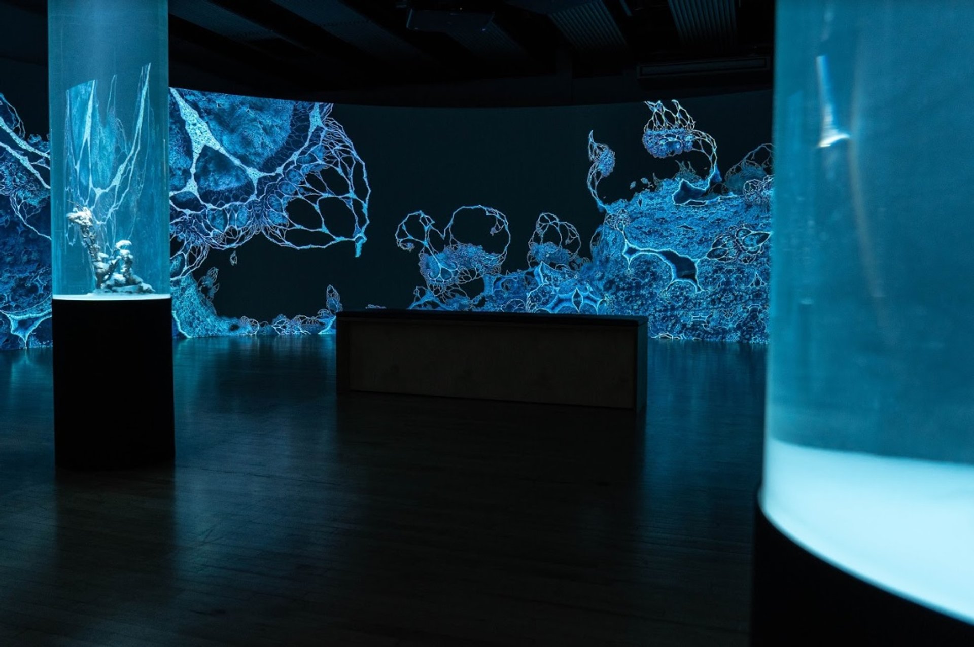 Vue d’installation de l’exposition « Hicham Berrada: Dreamscapes », HENI Project Space, Hayward Gallery, 2019. © ADAGP Hicham Berrada. Photo : Pete Woodhead. Courtesy de l’artiste et kamel mennour, Paris/London