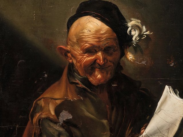 La toile figure le modèle préféré de l’artiste pendant sa période romaine, un vieillard chauve représentant avec humour la connaissance. Cette allégorie du savoir vient contrecarrer la représentation classique du penseur de l’Antiquité. Les recherches du peintre en matière d’éclairage et le choix d’un homme disgracieux pour représenter un savant font écho au clair-obscur et à l’art provocateur du Caravage, lui aussi actif dans la Ville éternelle au début des années 1600.