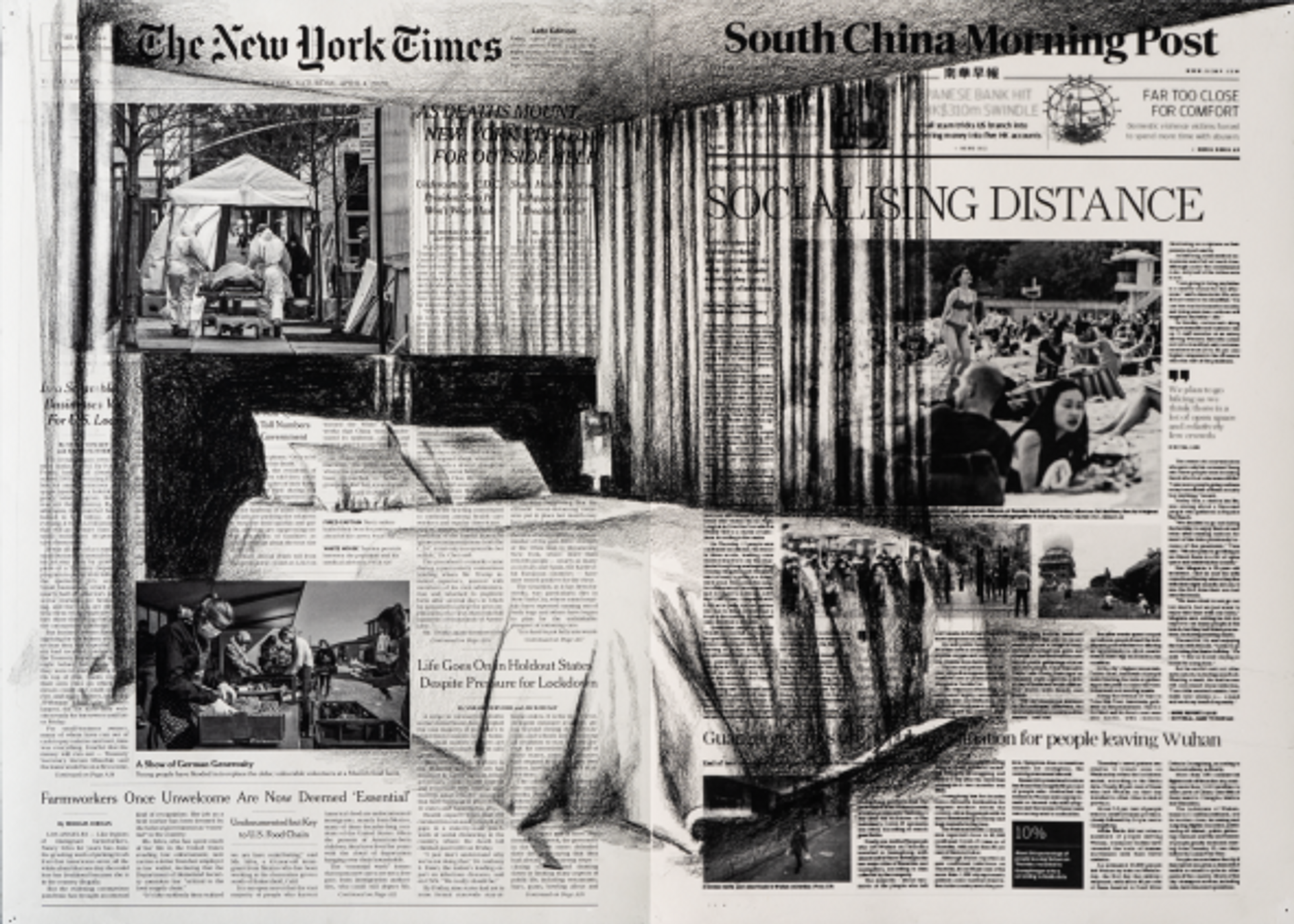 Tatiana Trouvé, 4 Avril 2020, The New York Times, USA, South China Morning Post, Chine, de la série Front Pages, 15 mars - 25 avril, 2020. Crayon sur papier. Crédit photo : Florian Kleinefenn. Courtesy Gagosian D.R.