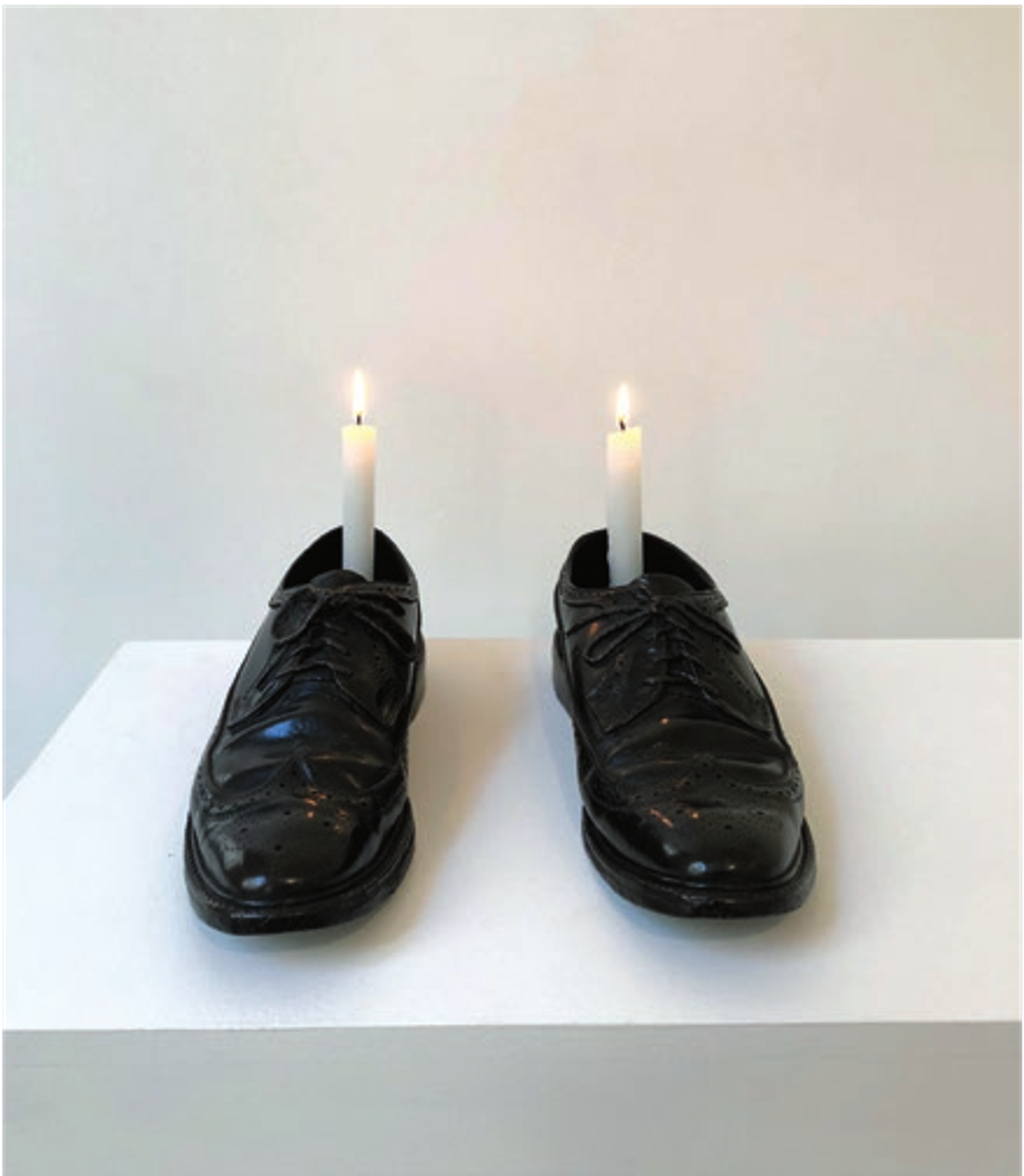 Une première version du Proverbe turc a existé en 1998 avec de vraies chaussures et bougies. Pour d’évidentes raisons de sécurité, cette présentation serait aujourd’hui impensable dans un lieu public. Erik a ensuite réalisé la variante que nous connaissons, avec des chaussures en bronze. C’est à cette époque qu’il a produit quelques paires isolées, plus faciles à vendre, pour financer les coûts conséquents de fabrication de l’installation : nous parlons tout de même de quatre-vingts bronzes ! Depuis, les bougies en cire ont été remplacées par des bougies électriques. Pour la petite histoire, la dernière fois que nous avons montré l’œuvre à la galerie, en 2012, nous avions décidé d’utiliser d’authentiques bougies. Nous avons dû tout repeindre ensuite !