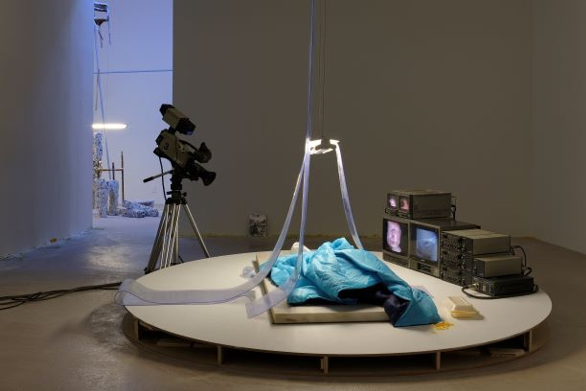 Aussi dystopiques que métaphysiques, ces épisodes sont le résultat de performances filmées. Une scène d’une heure est ainsi répétée et travaillée dans ses différences, à vingt-quatre reprises. À l’IAC, cette structure narrative est appliquée au reste de l’espace, la réminiscence et la mise en abîme d’éléments extraits des films jouant sur une logique d’épuisement. Dans cette ambiance crépusculaire, les gisants sont vivants, le sel et la colophane, qui servent traditionnellement à conserver les corps, se mêlent à la moisissure, des caméras de télévision filment des masques qu’un algorithme mute en bébé crépitant, un tronc d’arbre se transforme en bureau présidentiel, les murs suintent, et les rouages d’une mystérieuse dynamique transpercent l’espace…