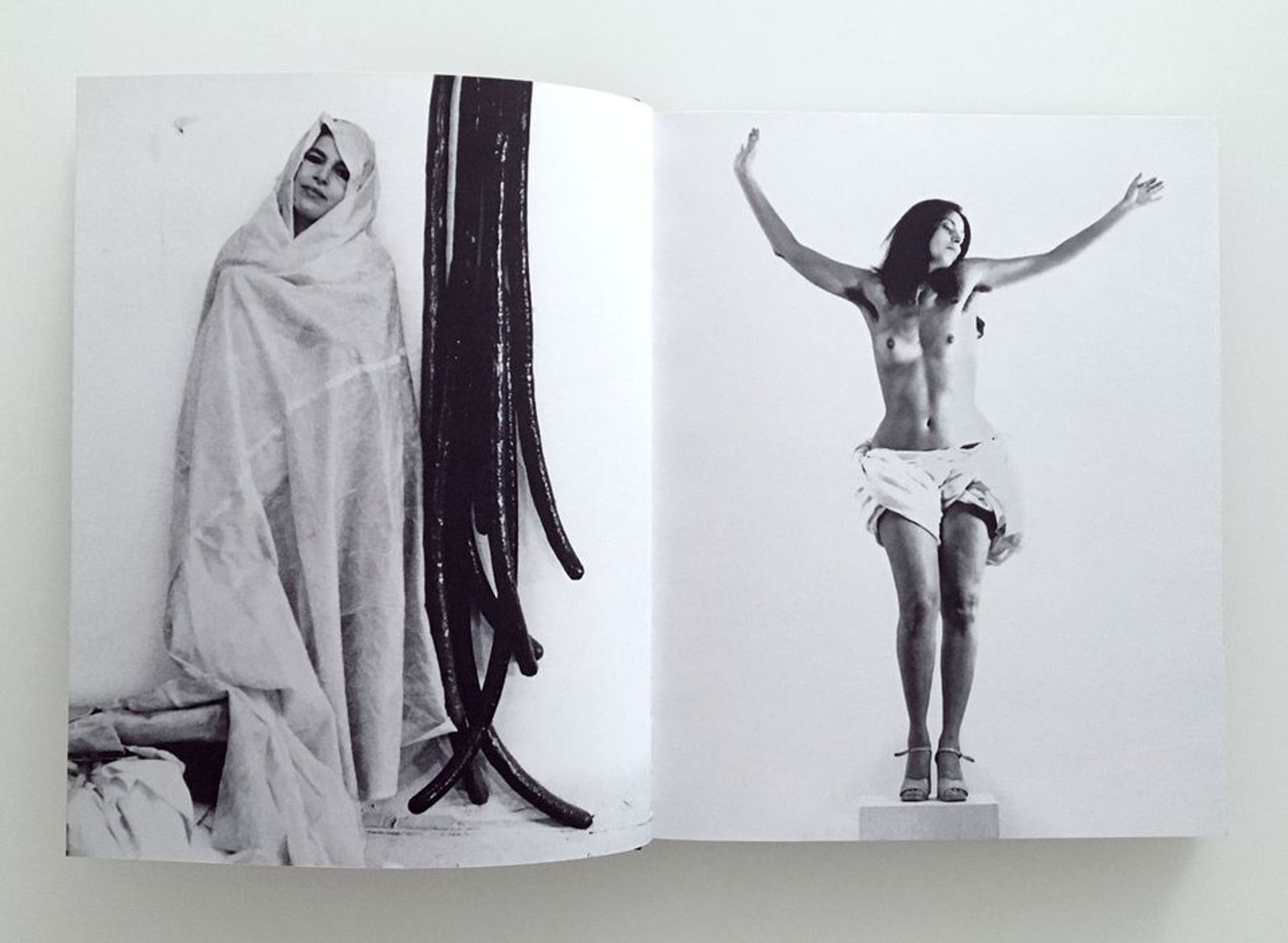 Extrait du catalogue montrant Eva Hesse avec sa sculpture Several dans son atelier de New York en 1969 et l’œuvre de Hannah Wilke Super-t-Art (1974). D.R.