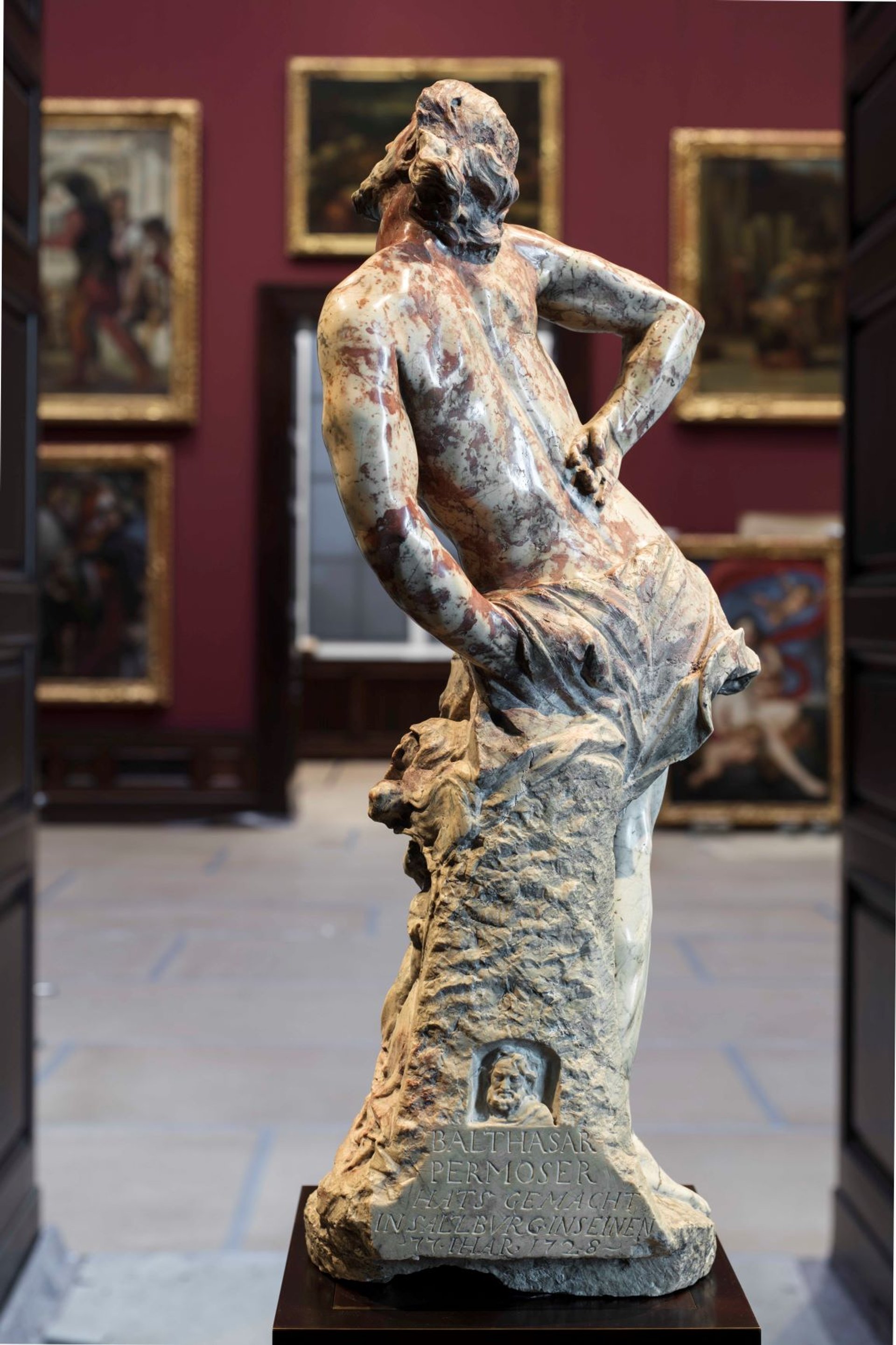 Seules les dernières expositions laissaient présager le bilan époustouflant de ces longs travaux, menés discrètement. Elles ont permis au musée partiellement ouvert à la visite ces dernières années, de révéler au compte-goutte le fruit des restaurations successives, comme celle, spectaculaire, d’un cycle complet de Véronèse en 2018. Nombre de cadres du XVIIIe siècle sont eux aussi passés entre les mains des restaurateurs, pour en raviver l’éclat. Riches d’ornements rocaille et surmontés par les armes de la couronne polono-saxonne, ils contribuent pour beaucoup à faire de la collection dans son ensemble une œuvre d’art. La multiplication regrettable des vitres de protection sur les tableaux, qui nuit souvent à leur appréciation, est vite oubliée au regard de l’extrême accessibilité des pièces exposées, sans mise à distance excessive et la plupart du temps sans vitrine. Cette présentation est particulièrement pertinente pour des sculptures dont nous pouvons désormais faire le tour et admirer les moindres détails. Cela favorise de jolies surprises, comme au revers d’un Christ à la colonne de Balthasar Permoser : en lieu et place de la signature, un petit autoportrait est sculpté à même le socle. Artiste rare remis à l’honneur à Dresde, Permoser y apparaît comme le plus insigne successeur du Bernin dans l’aire germanique. Ses figures monumentales d’Apollon et Minerve, exécutées pour le nymphée du Palais du Zwinger, accueillent d’ailleurs les visiteurs dans le hall du Semperbau.