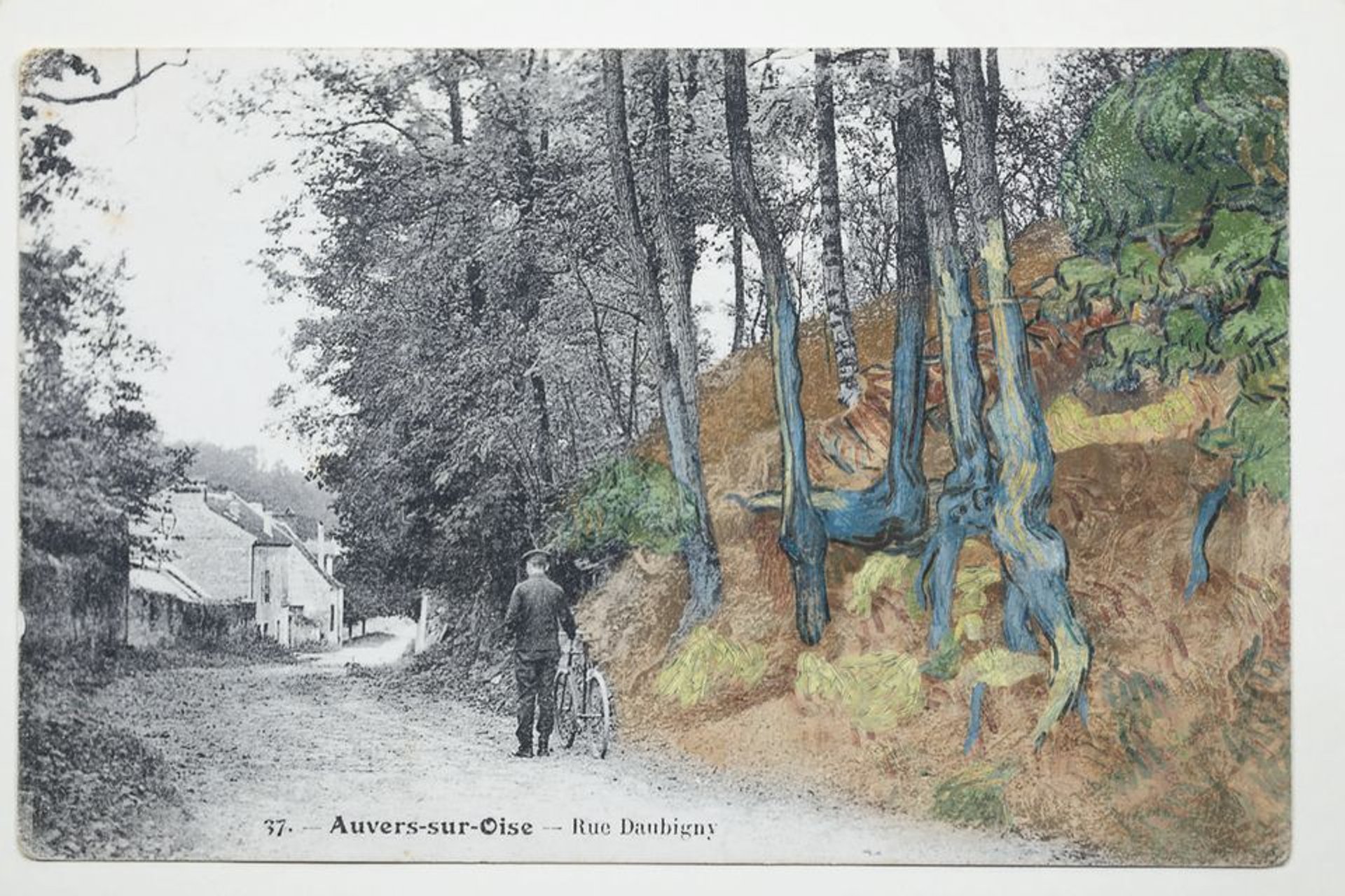 La peinture Racines d’arbres en partie superposée à la carte postale. © Arthenon