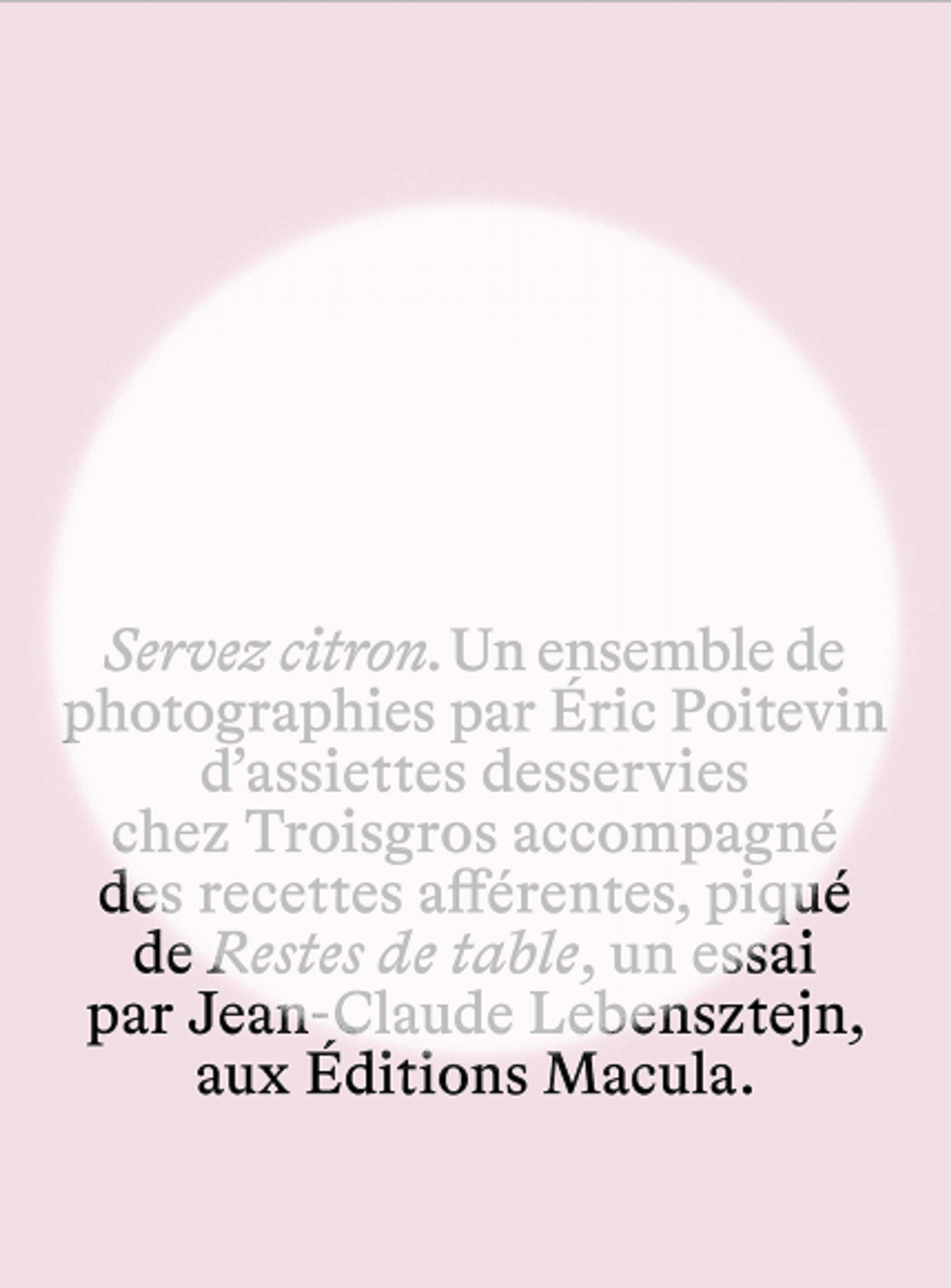 Dès la lecture du sommaire de Servez citron (Éditions Macula), on a le sentiment que, des « restes de table » qui l’ouvrent aux « mises en place » sur lesquelles il se conclut, ce livre avance à rebours. S’il endosse certains aspects du livre de cuisine, c’est pour mieux en fouiller les dessous, en exposant ce que l’on escamote – le travail et les restes. Les trois composantes de l’ouvrage y concourent, avec les résonances qu’il ménage entre elles : un essai de Jean-Claude Lebensztejn, consacré aux manières de table et accompagné d’extraits du Cuisinier françois de François Pierre de la Varenne (1625), le premier livre de cuisine moderne; une série de photographies d’Éric Poitevin; et un choix de recettes de César et Michel Troisgros.