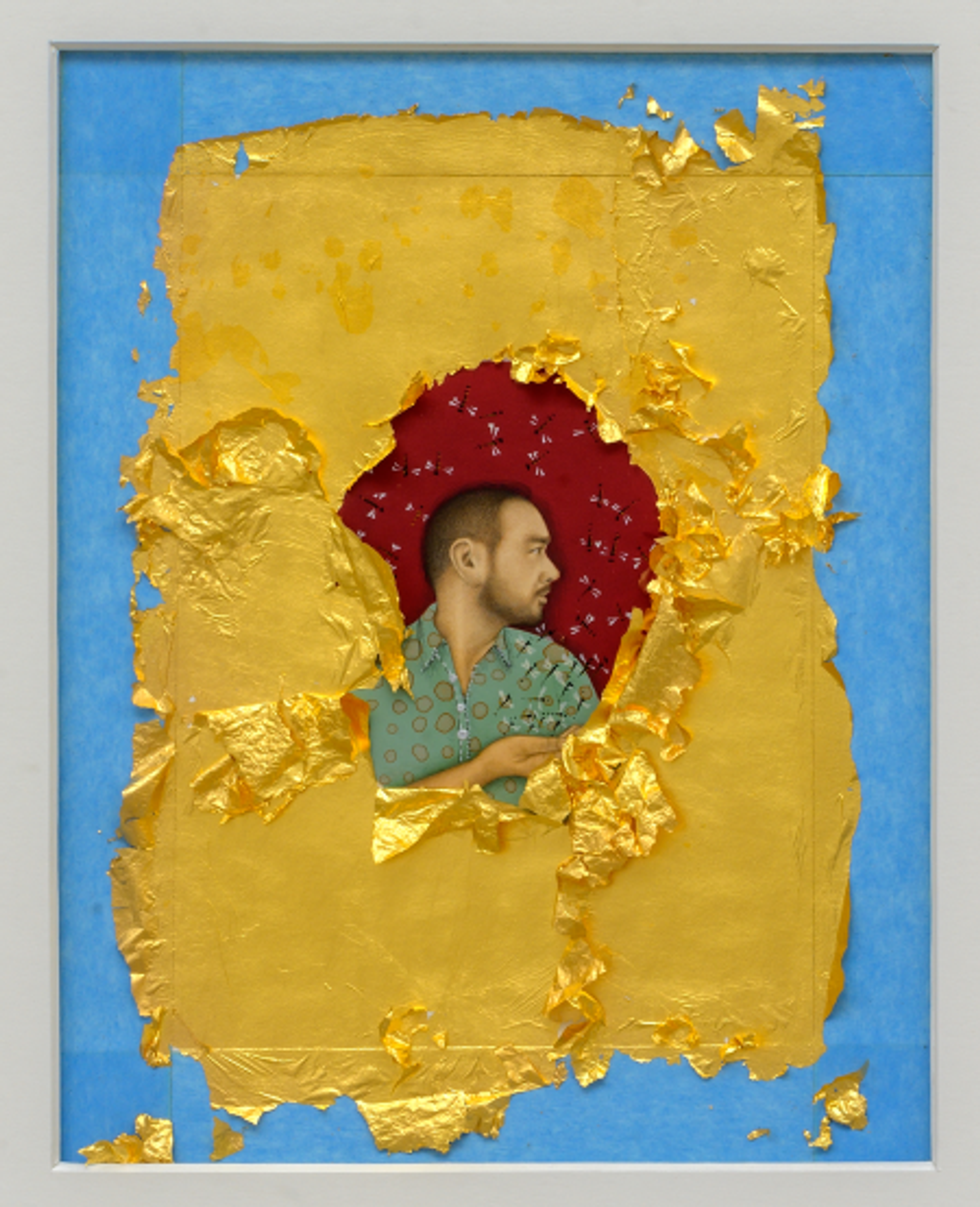 L’œuvre choisie, Monologue, est un double autoportrait de l’artiste à la gouache et à la feuille d’or sur papier. L’un présente des taches de peinture rouge, l’autre des taches de sang. Chez Christian Louboutin, le rouge fait évidemment écho à la couleur de ses semelles, un geste improvisé avec le vernis à ongles d’une de ses assistantes, mais un rouge totalement différent, laqué et joyeux. Les deux autoportraits ont un fond d’or, dont les feuilles ne sont pas complètement collées sur le papier et tremblent dans l’air, comme celles que l’on applique sur les Bouddhas de bois en Thaïlande à l’entrée des temples, que Christian Louboutin affectionne particulièrement. C’est lui qui a inspiré cette création à Imran Qureshi. L’œuvre, prêtée pour l’occasion, est accrochée dans la partie de l’exposition qui dévoile le musée imaginaire de Christian Louboutin. Une autre intervention d’Imran Qureshi est visible un peu avant dans le parcours, une paire de souliers masculins qu’il a recouverte de feuilles d’or.