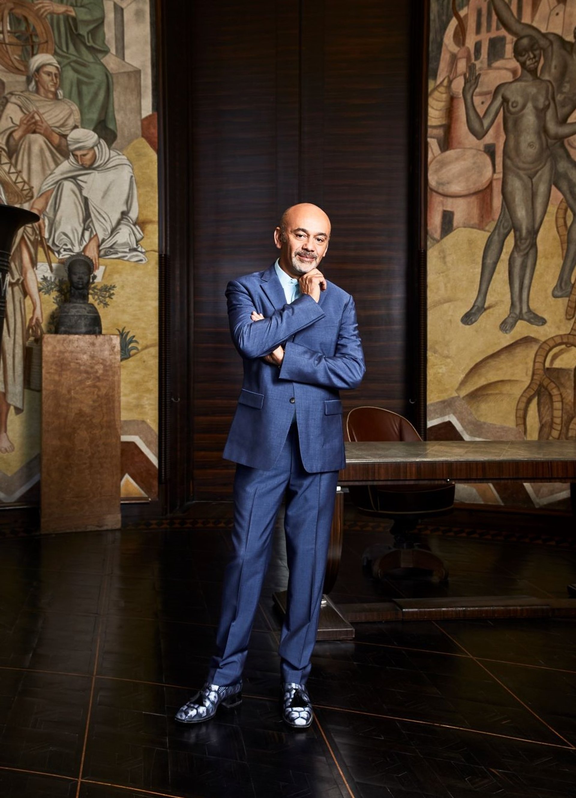 À trois pas de la galerie Véro-Dodat, rue Jean-Jacques Rousseau où il a installé sa première boutique en 1991, Christian Louboutin reçoit dans son bureau dont l’entrée est gardée, sous une grande verrière, par deux sphinx achetés aux États-Unis, ancien décor de cinéma dont il n’a jamais retrouvé l’origine. Au plafond, deux lustres en forme d’étoile des années 1940. Au fond de la pièce, dressée sur ses deux pattes arrière, une gazelle naturalisée (à moins que ce ne soit un animal plus rare) guette aussi les visiteurs. Christian Louboutin aime les objets, mais il n’est pas vraiment collectionneur. Ce n’est pas le goût de la possession qui le guide, plutôt celui des rencontres, avec des objets ou des humains.