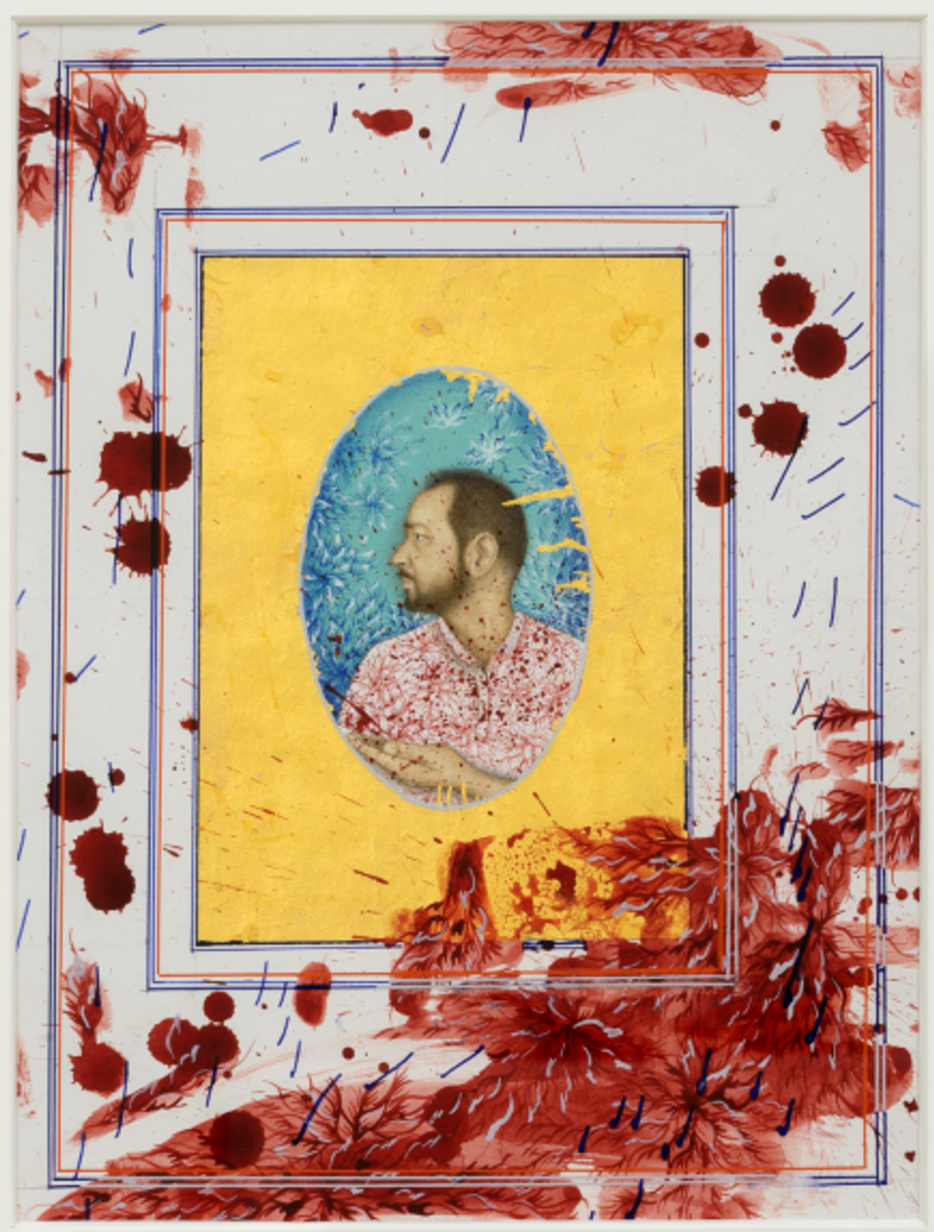 l’œuvre choisie, Monologue, est un double autoportrait de l’artiste à la gouache et à la feuille d’or sur papier. l’un présente des taches de peinture rouge,l’autre des taches de sang.