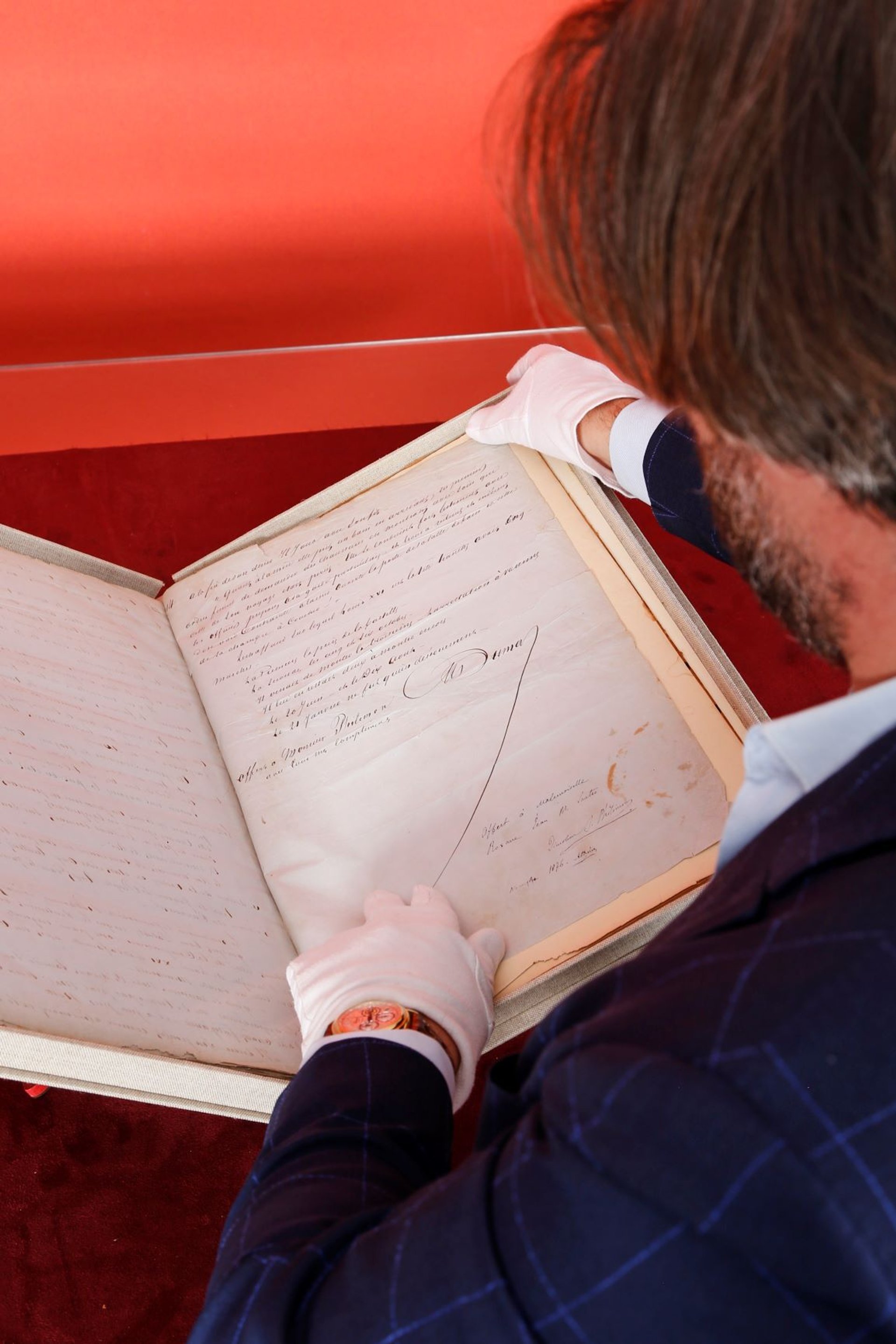 Dimitri Joannidès tenant le manuscrit de La Route de Varennes d’Alexandre Dumas. © FauveParis