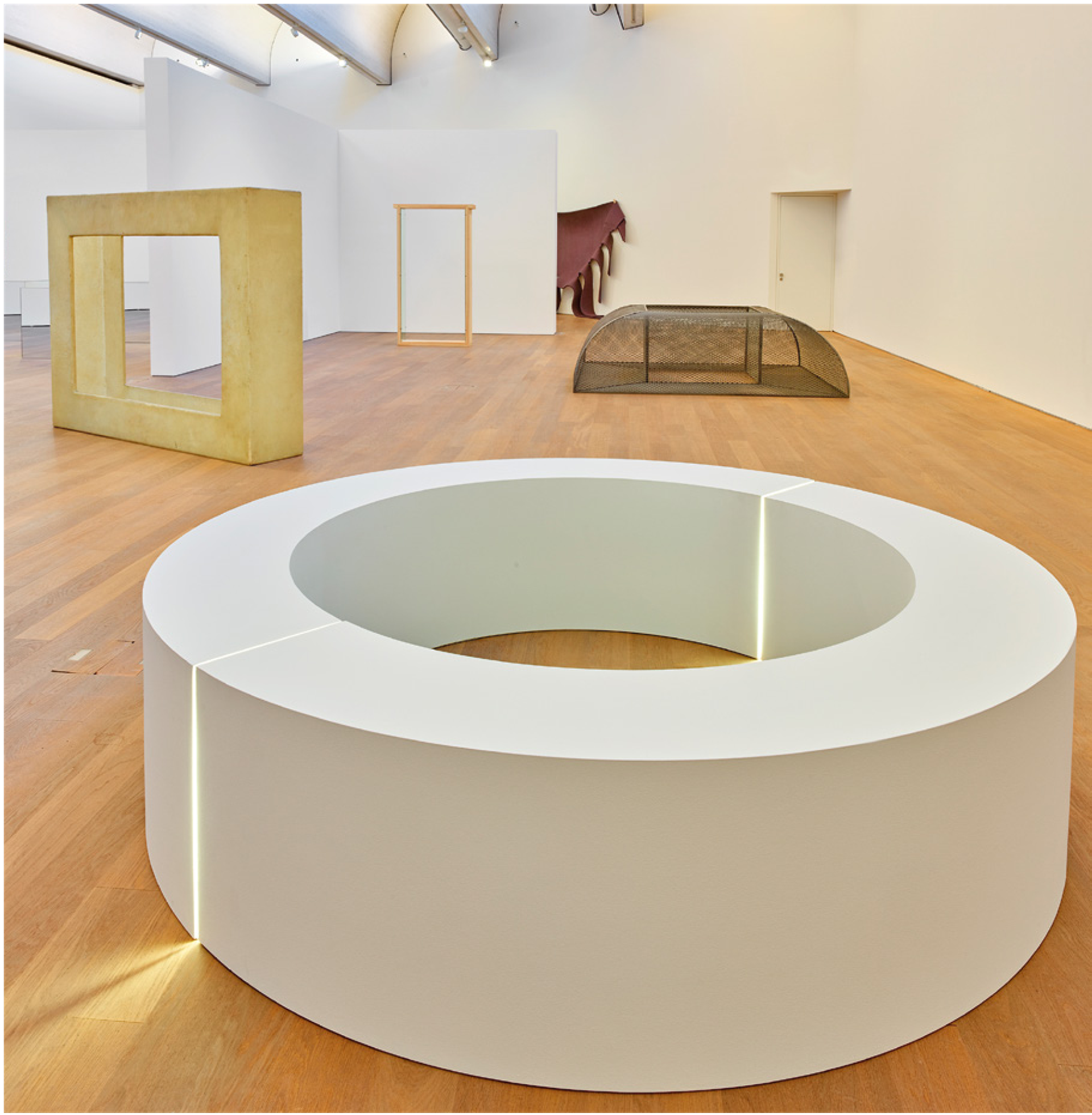 Vue de l’exposition «Robert Morris. The Perceiving Body», Mudam, Luxembourg, avec Untitled (Ring with Light), 1965-1966, New York, Robert Morris Estate/Castelli Gallery; Untitled (Fiberglass Frame), 1968, New York, Guggenheim Museum; Untitled (Quarter-round Mesh), 1967-1968, New York, Guggenheim Museum; Untitled (Pine Portal with Mirrors), 1961-1978, New York, Robert Morris Estate/Castelli Gallery. © Mudam Luxembourg. Photo Rémi Villaggi