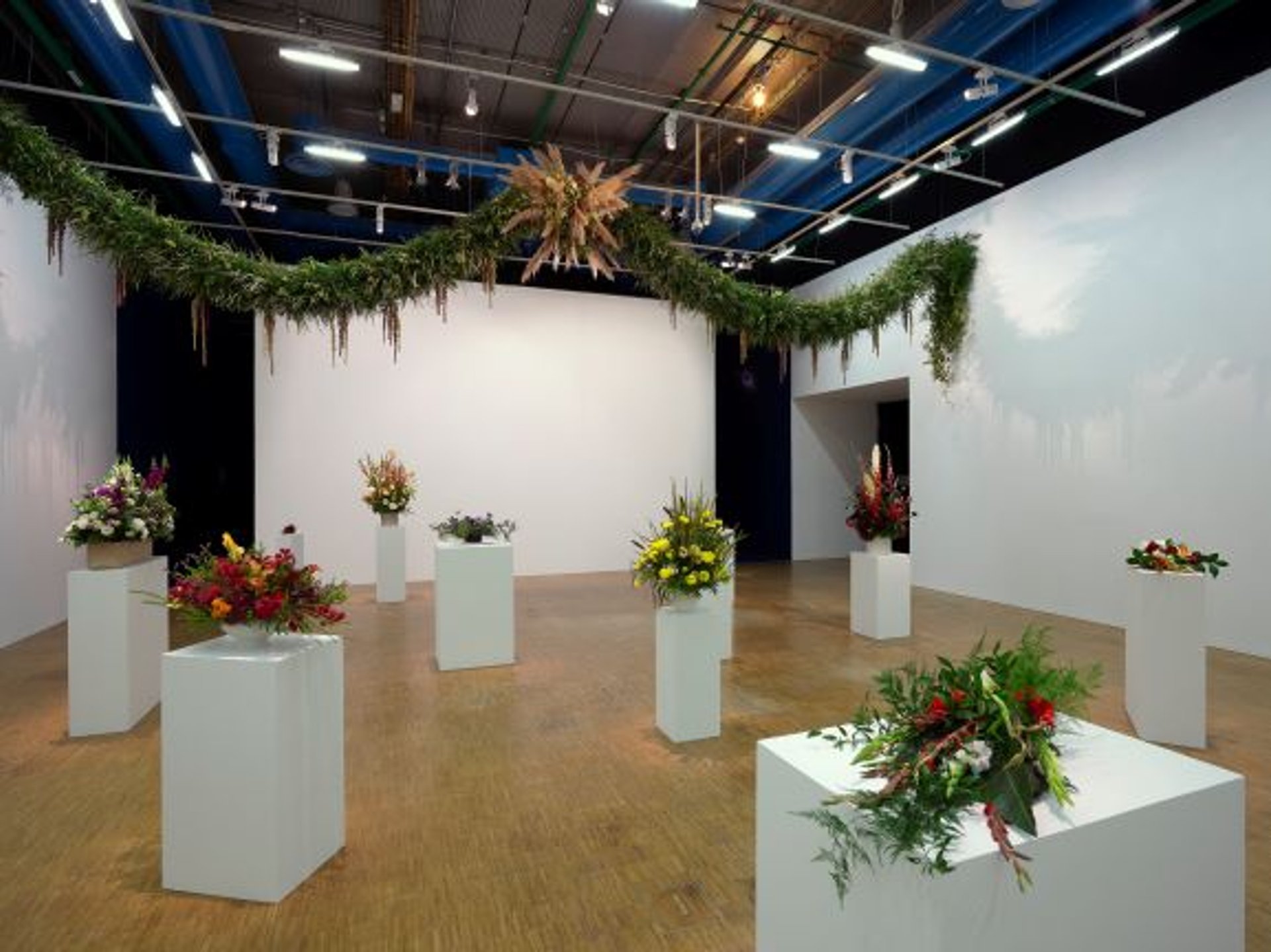 Flowers for Africa: Tunisia, 2014 Protocole de réalisation et de présentation comprenant une image d’archive destinée à guider la reconstitution d’un arrangement floral composé de fleurs coupées. Dimensions variables Collection FRAC Ile-de-France, Paris. Vue de l’exposition A Time for New Dreams, Serpentine Galleries, Londres, 2019 Photo: readsreads.info Courtesy the artist and galerie Poggi, Paris