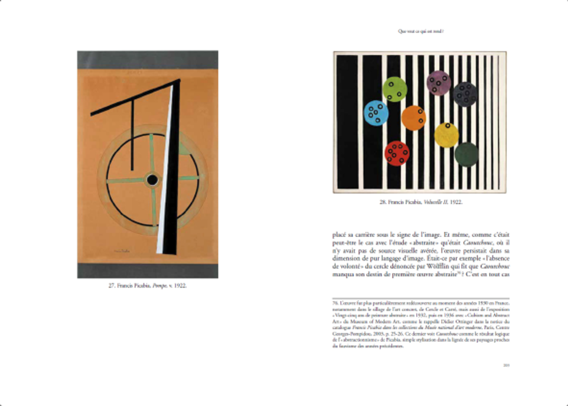 Singulier enfin parce qu’elle se concentre sur la période dada de Picabia, non pour la constituer en rupture par rapport aux autres, mais pour démontrer que s’y manifestent des mécanismes semblables et ainsi « tenter de sortir du schéma binaire d’un récit historique qui réduit souvent l’artiste à une figure de l’avant-garde ayant adopté par la suite des positions réactionnaires » (p. 308). Pour ce faire, elle revient sur les portraits mécanomorphes et l’usage des taches, sur le rapport à la photographie et à la signature, mais elle réinterroge aussi les relations entre Francis Picabia et Marcel Duchamp et celles, moins évidentes, quoique plus significatives, qu’il entretenait avec Pablo Picasso.