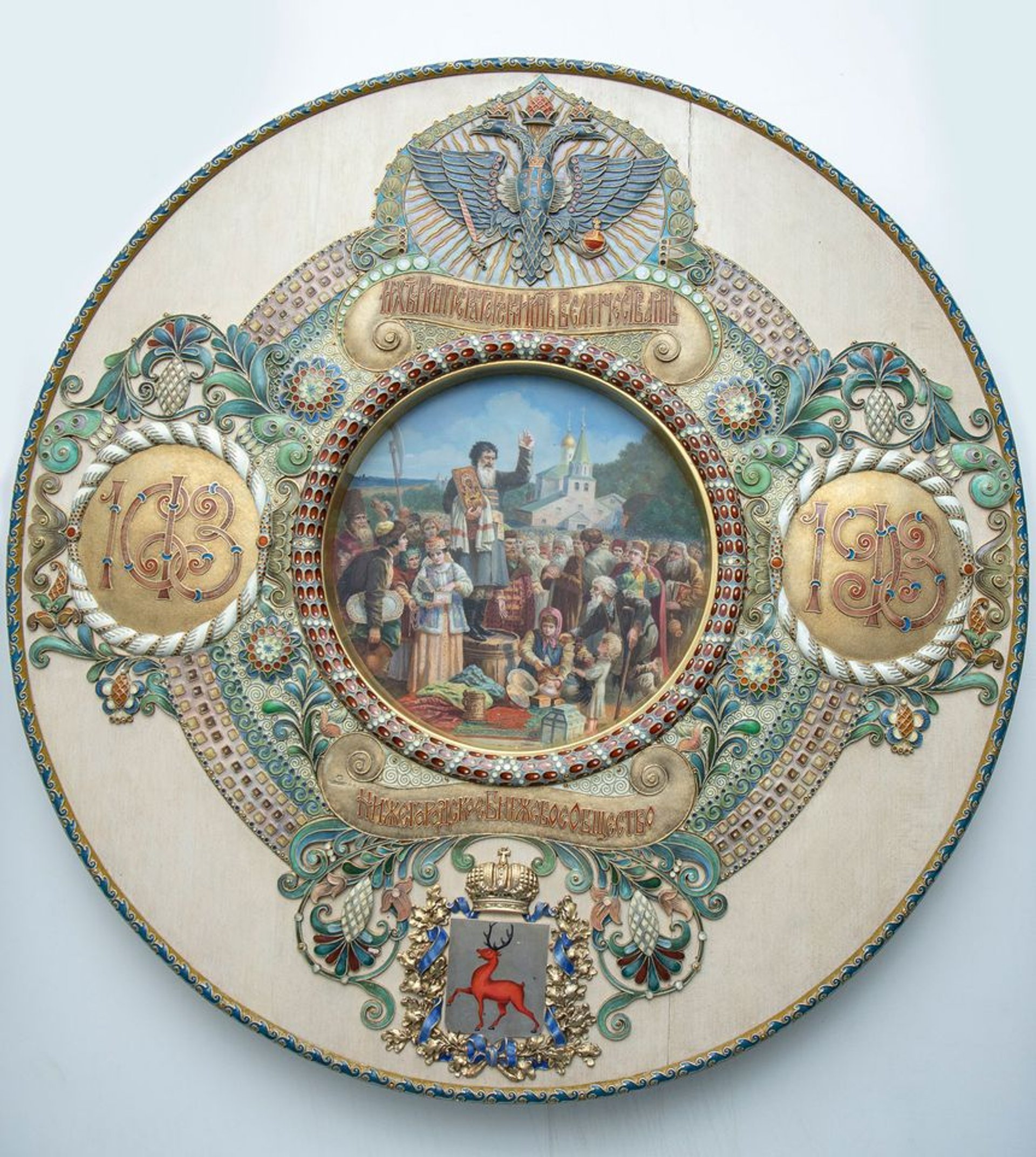 Plateau en émail champlevé (1913) réalisé par la société I. Khlebnikov, offert à Nicolas II et Alexandra Feodorovna par la société boursière de Nijni Novgorod. © Nizhny Novgorod Novgorod State Reserve Museum of History and Architecture.