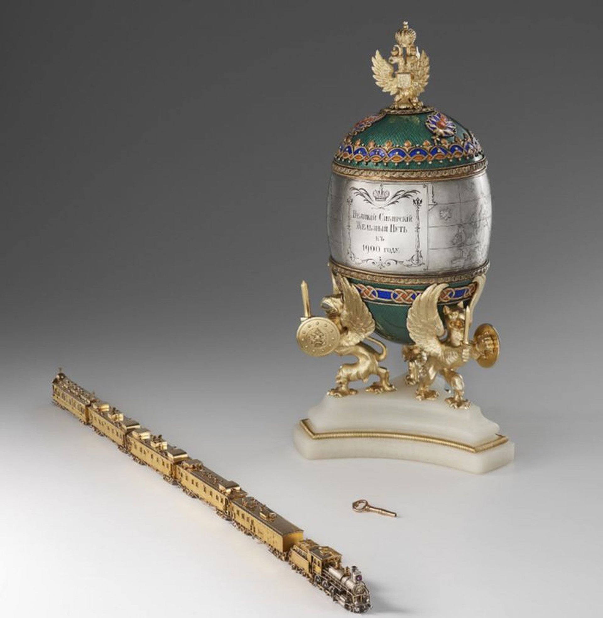 Deux œufs de Pâques montrent comment les ingénieux bijoutiers de Fabergé cherchaient à satisfaire leurs clients impériaux avec des créations contemporaines s’inspirant de l’héritage russe. L’un d’entre eux, réalisé en 1906, possède un dôme en or coiffant un groupe de tours émaillées vertes et blanches, caractéristiques des églises russes. Un autre de 1900, signé de M.Perkhin et décoré de motifs traditionnels en émail russe, est entouré d’une carte de la Russie impériale montrant la nouvelle grande ligne de chemin de fer sibérienne, la plus longue du monde. Son petit train a des phares en diamant, une lampe en rubis et des fenêtres en cristal de roche. Cet œuf fut un cadeau du dernier empereur de Russie, Nicolas II, à sa femme Alexandra Feodorovna.