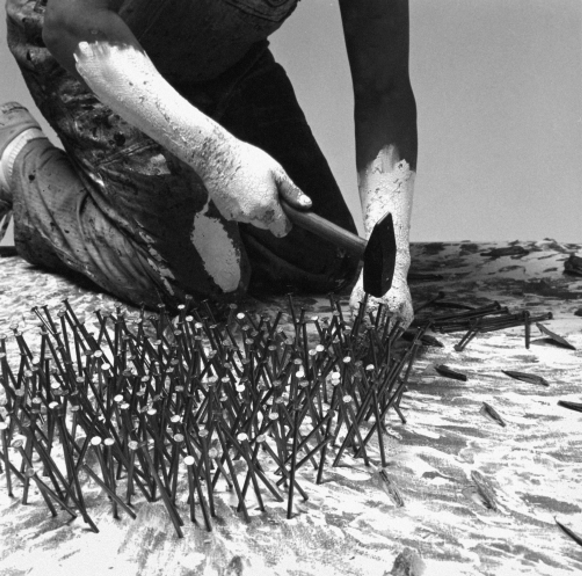Günther Uecker, Wo sich zwei Linien berühren ist ein Punkt, dort schlage ich einen Nagel ein, den Punkt bestimme ich [Là où deux lignes se touchent, il y a un point, c’est là que je plante un clou ; je détermine l’emplacement du point], désert libyen, 1974, photographie. © Wilfried Kaute, courtesy Uecker Archiv