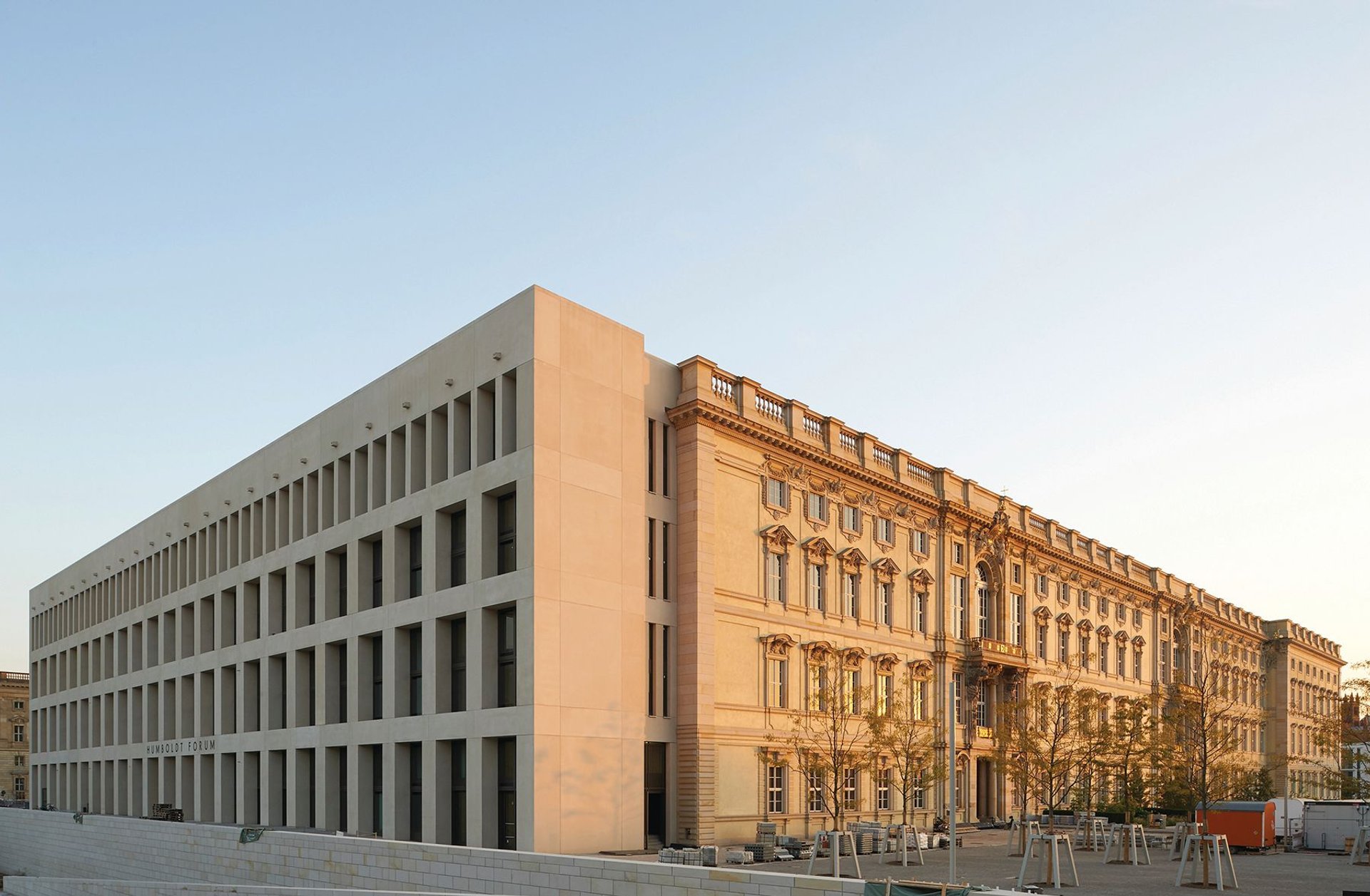 L’architecte italien du nouveau bâtiment, Franco Stella, décrit le projet du Forum Humboldt comme une « nouvelle interprétation » qui combine « l’ancien et le nouveau ». Mais de l’extérieur, l’ancien l’emporte : les façades baroques d’origine ont été soigneusement reconstituées sur trois côtés; une seule, donnant sur la Spree, est moderne. Le portail ouest est couronné d’un dôme surmonté d’une croix dorée. Comme l’a déclaré le sénateur pour la Culture de Berlin Klaus Lederer, la croix « contredit à peu près tout ce que nous attendions du Forum Humboldt – montrer à quel point nos racines sont ambivalentes, entrelacées, larges et profondes ».