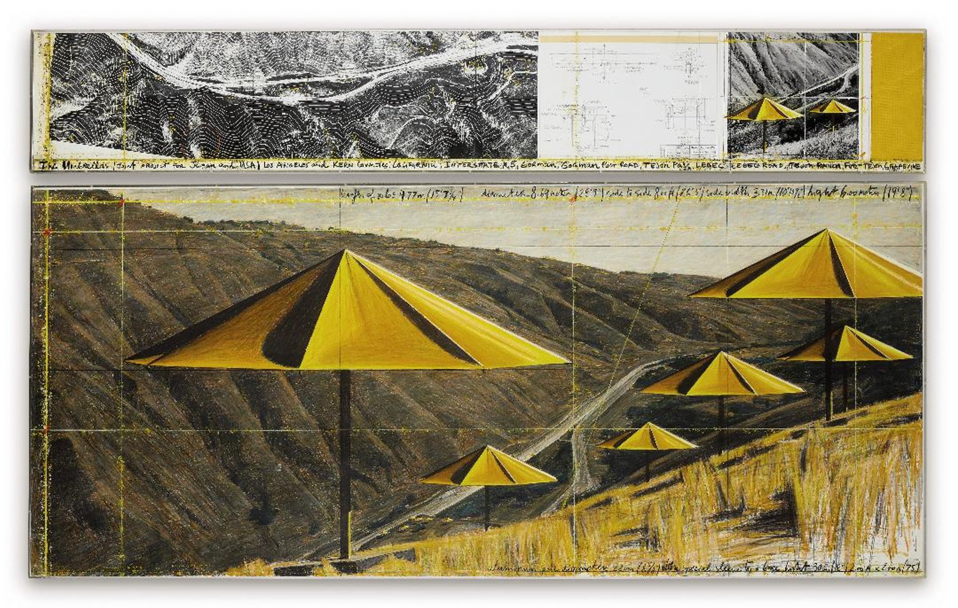 Christo, The Umbrellas (joint project for Japan and USA), 1991, crayon, fusain, crayon gras, tissu, collage de papier sur papier, 108×245 cm. Estimé 200 000 - 300 000 euros. Courtesy Sotheby’s. D.R.