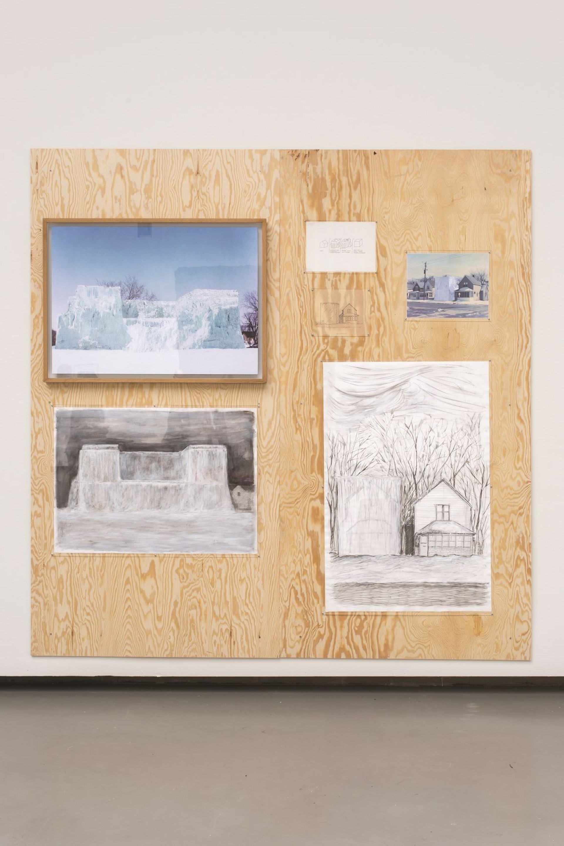 Ce sont en majorité ces travaux, et quelques-uns plus récents, qui sont présentés à La Verrière-Hermès, autour d’une installation de sofas rectangulaires et (théoriquement) modulables qui occupent le centre de l’espace et invitent le visiteur à s’y asseoir (Rumble Sofa, 1967). Celui-ci aura alors immanquablement l’attention attirée par l’œuvre sans doute la plus surprenante de l’exposition et l’une des plus emblématiques du travail de Gianni, l’Ice House. Il s’agit de cette maison, située dans la banlieue de Minneapolis, aux États-Unis, que durant l’hiver 1971 l’artiste recouvrit de glace avec ses étudiants pour la transformer en glaçon géant à l’échelle urbaine.