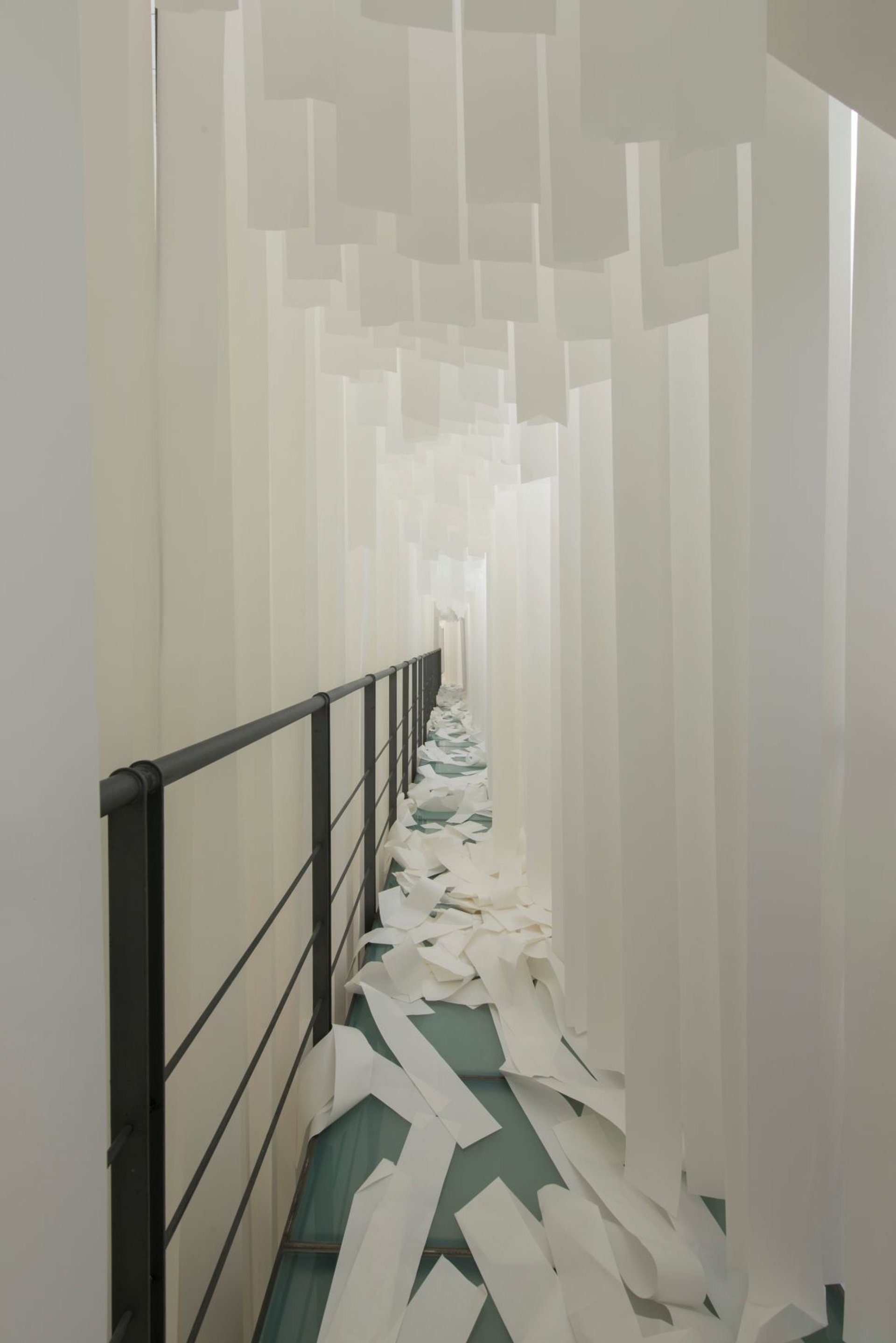 Non loin de La Verrière, dans les locaux de l’ISELP (Institut Supérieur pour l’Étude du Langage Plastique), Gianni Pettena a fait réactiver l’une de ses installations réalisées pour la première fois en 1971 dans une université américaine, Paper (Midwestern Ocean). Celle-ci se compose de milliers de bandes de papier blanc suspendues au plafond et descendant jusqu’au sol, légèrement écartées les unes des autres. L’installation ressemble à un vaste pénétrable souple, occupant l’intégralité du volume des salles. Munis de ciseaux, les premiers visiteurs sont invités à découper ces bandes de papier pour se frayer un passage dans cette masse flottante, au fur et à mesure de leur progression. Ils créent ainsi des trouées qui finissent par tracer le chemin d’un labyrinthe.