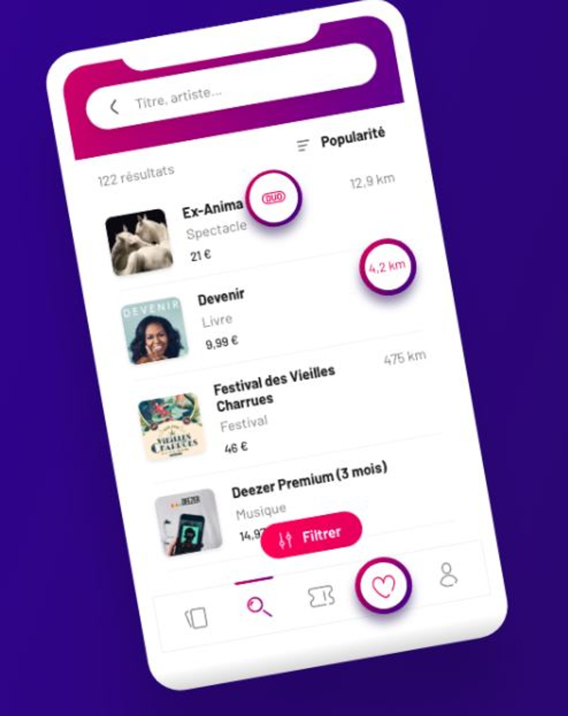 Liste d’offres accessibles via l’application Pass Culture. © ministère de la Culture