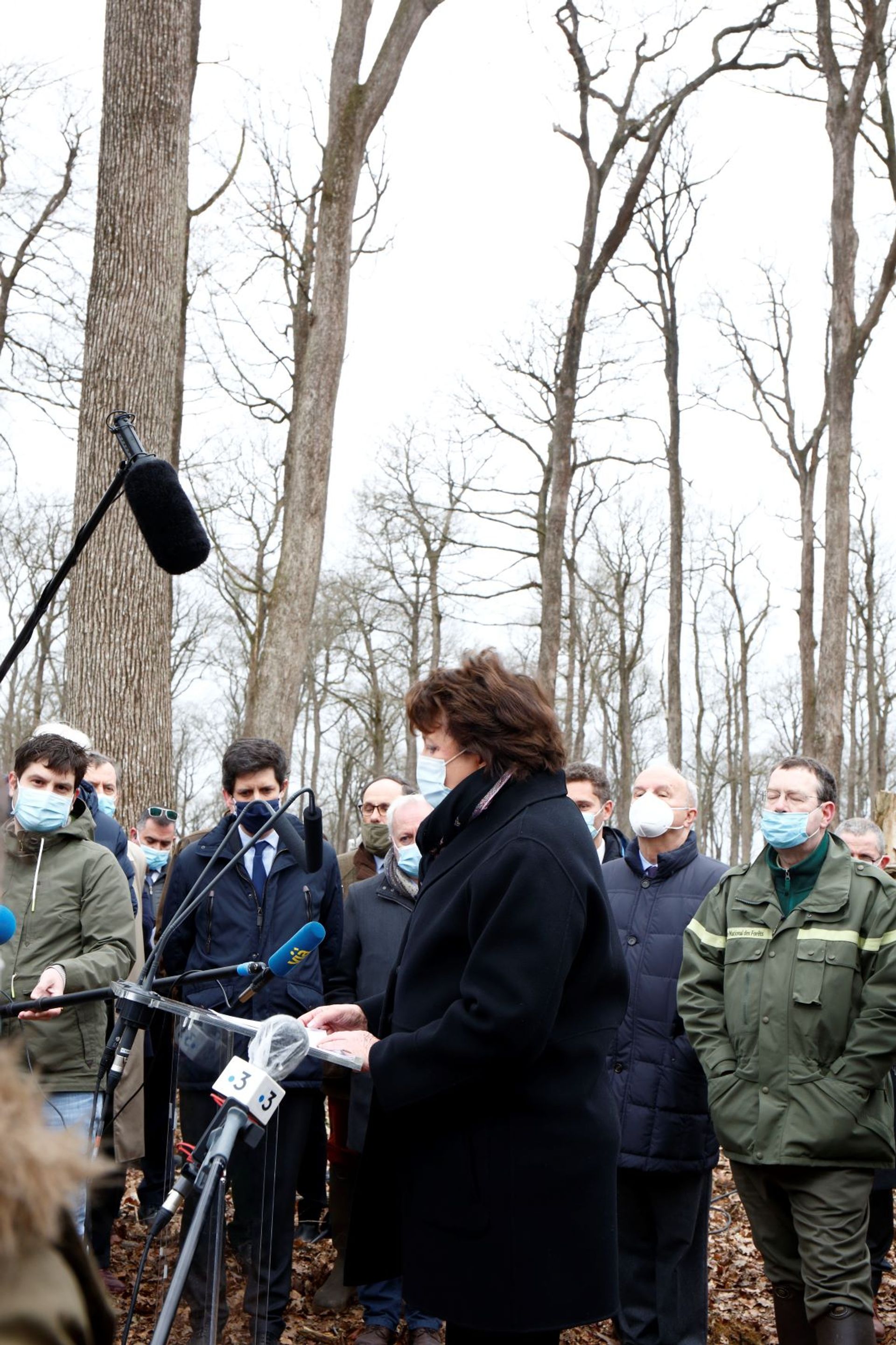Allocution de Roselyne Bachelot, ministre de la Culture, forêt domaniale de Bercé (Sarthe). © David Bordes / Établissement public chargé de la conservation et de la restauration de la cathédrale Notre-Dame de Paris