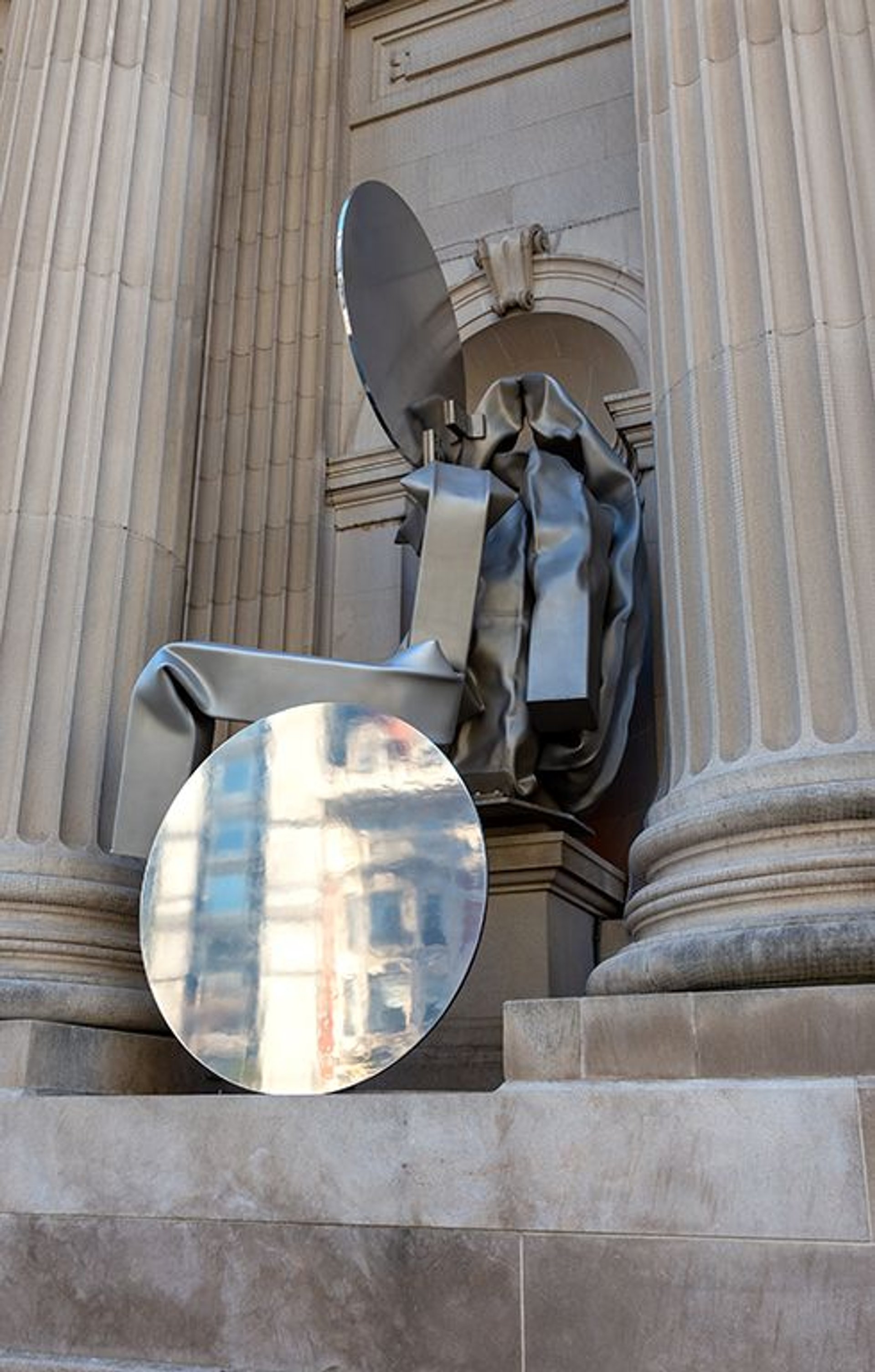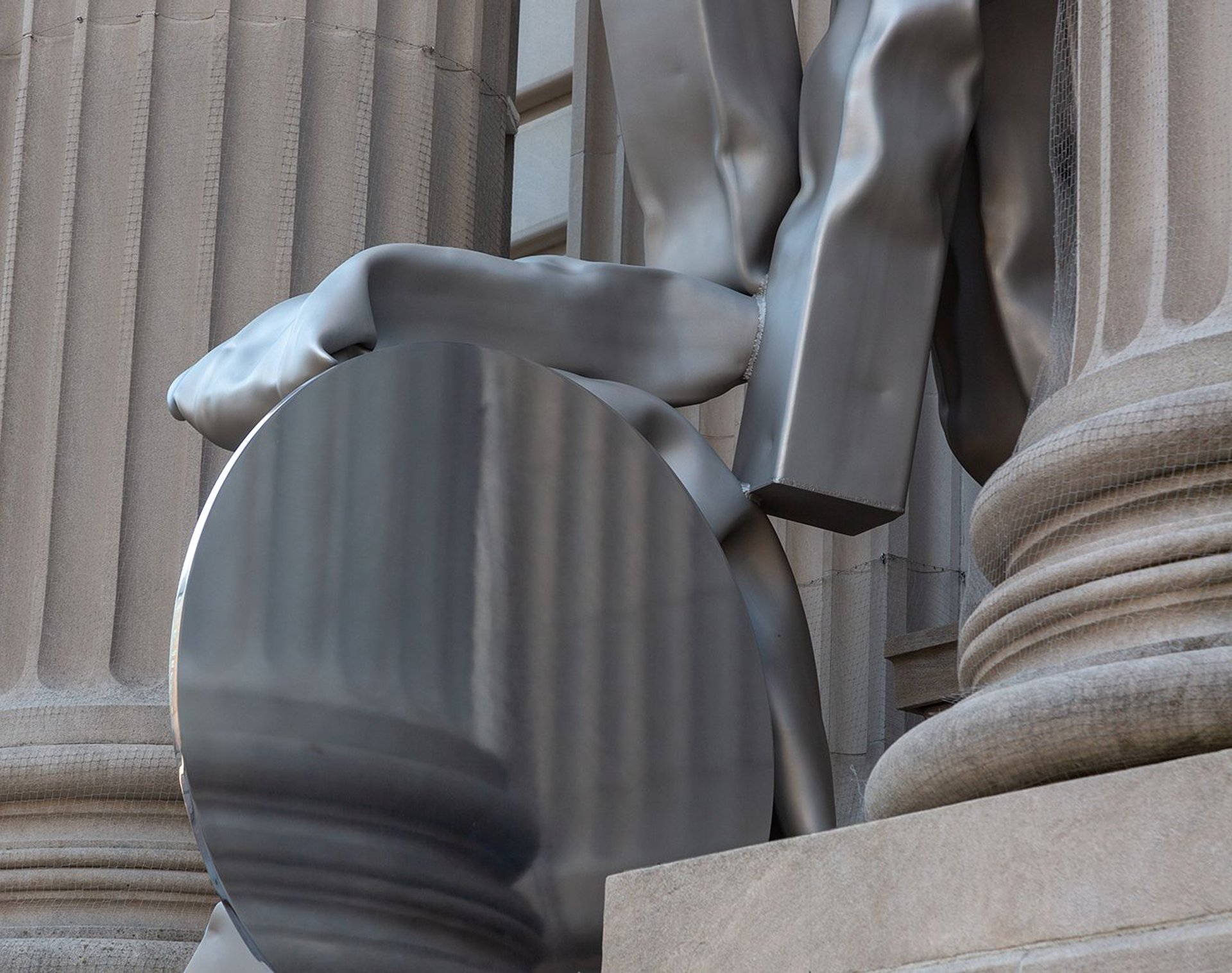 Finalement, Carol Bove a décidé de réduire la taille des disques d’aluminium et de calquer leurs dimensions sur le diamètre des colonnes qui flanquent les niches de la façade et sur les portraits en médaillon des écoinçons. « C’est comme utiliser ce vocabulaire employé par l’architecte et en faire un motif différent, dit-elle. C’est un motif qui est à la fois en continuité avec lui et en rupture ».