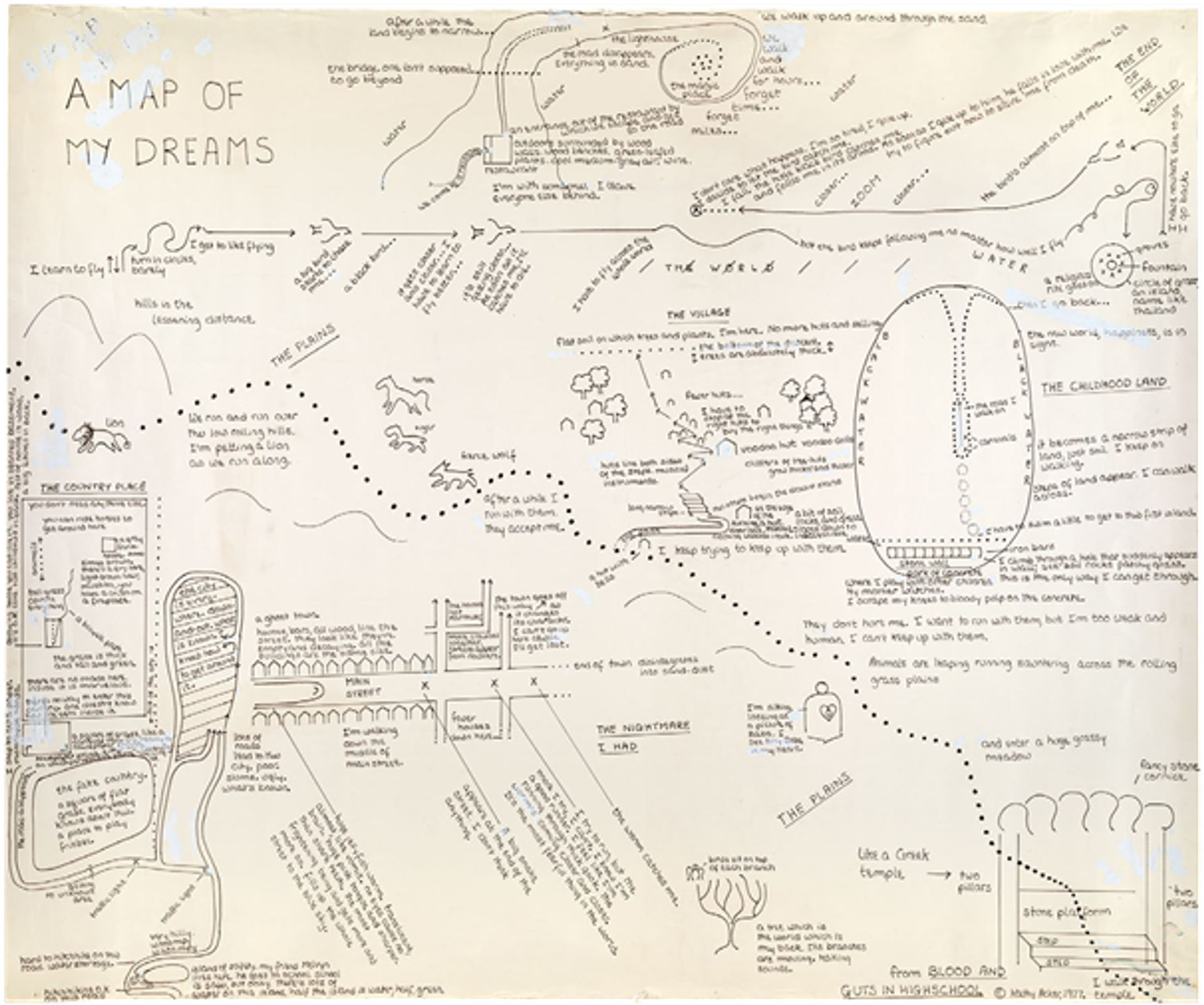 Kathy Acker, A Map of My Dreams [Carte de mes rêves], entre 1973 et 1978. © Kathy Acker/Éditions Laurence Viallet