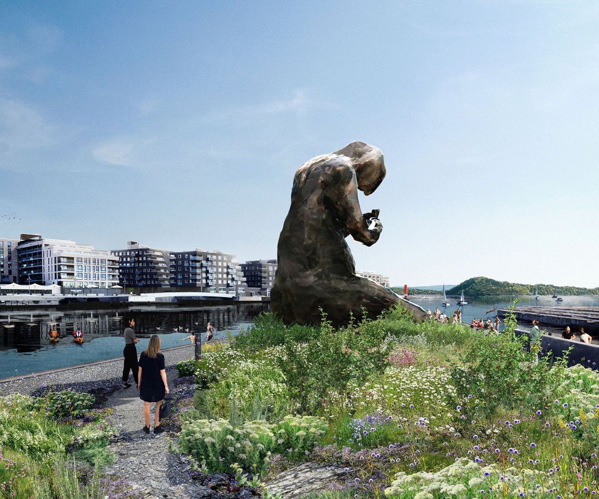 UNE FEMME AGENOUILLÉE AU-DESSUS D’UN ENFANT INVISIBLE, BIENTÔT INSTALLÉE AUX ABORDS DU NOUVEAU MUSÉE MUNCH