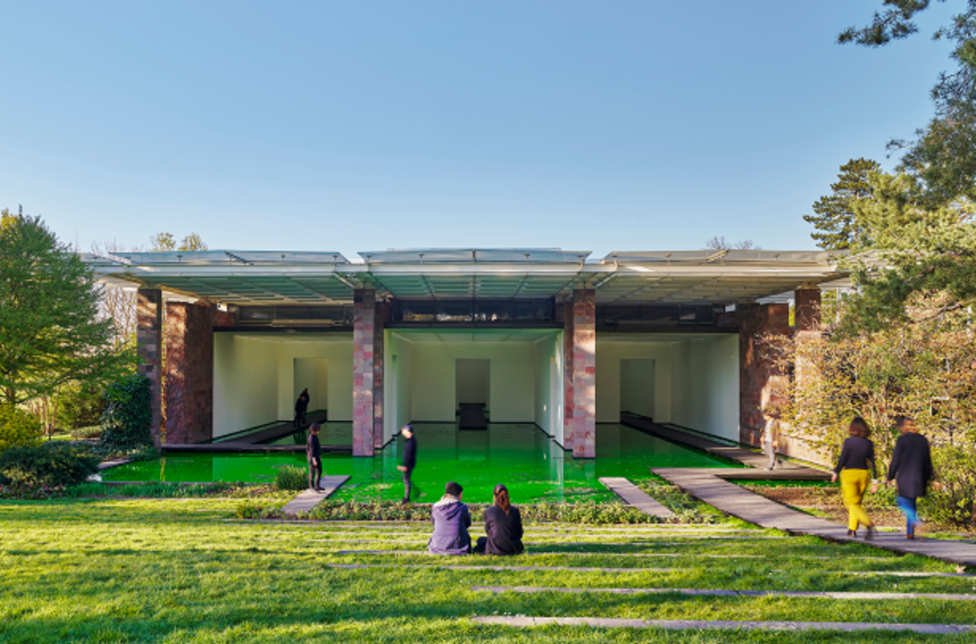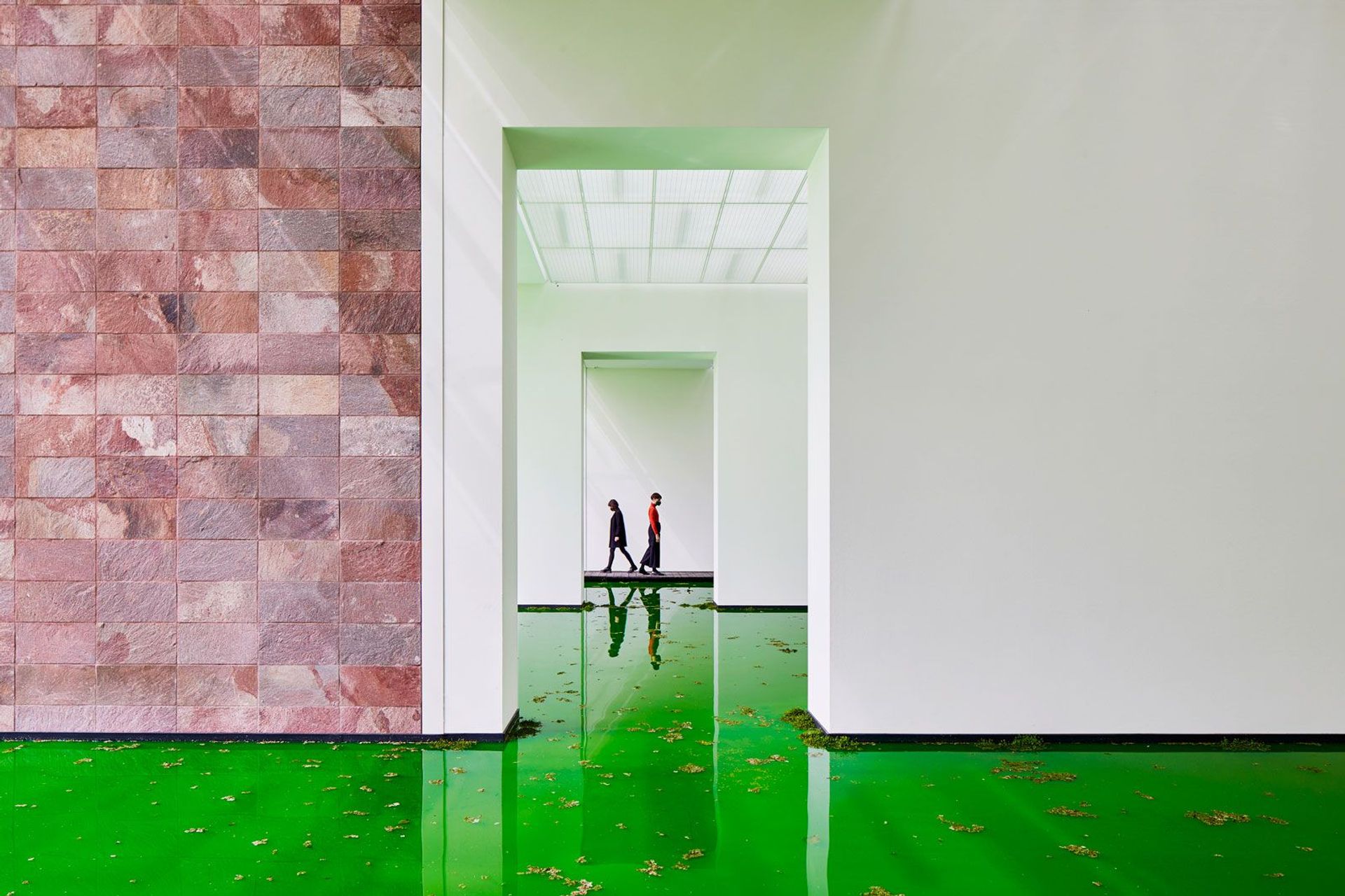 Ce dernier a ouvert un côté du bâtiment conçu par Renzo Piano (avec la bénédiction de l’architecte) pour laisser pénétrer dans le musée la mare qui habituellement se déploie devant, et qui est séparée de l’intérieur climatisé par de grandes baies vitrées. Les visiteurs peuvent dorénavant marcher sur l’eau, dont la profondeur peut atteindre 80 cm par endroits, en empruntant une série de passerelles qui entrent et sortent du bâtiment. La nuit, l’intérieur est éclairé par une lumière bleue.