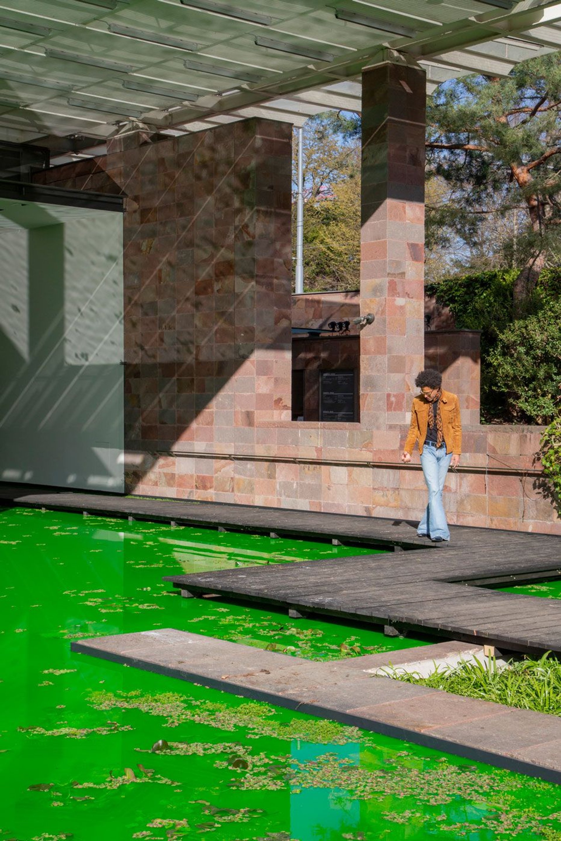 Olafur Eliasson a également teinté l’eau d’un vert fluorescent et a garni la mare de plantes, parmi lesquelles des nénuphars, des laitues d’eau, des fougères aquatiques sélectionnées par l’architecte paysagiste Günther Vogt. L’eau a été teintée à l’aide d’uranine, un colorant organique couramment utilisé pour observer les courants, et auquel Olafur Eliasson a déjà eu recours pour son œuvre Green River (1998), lorsqu’il avait coloré des cours d’eaux dans des villes comme Stockholm, Tokyo et Los Angeles. « De concert avec le musée, je cède le contrôle à l’œuvre d’art, écrit-il dans le communiqué qui accompagne l’exposition, et, pour ainsi dire, je donne tout pouvoir aux visiteurs humains, mais aussi aux visiteurs non-humains, aux plantes, aux micro-organismes, aux caprices du temps, au climat – un grand nombre d’éléments que les établissements artistiques s’efforcent habituellement de tenir à l’écart. »