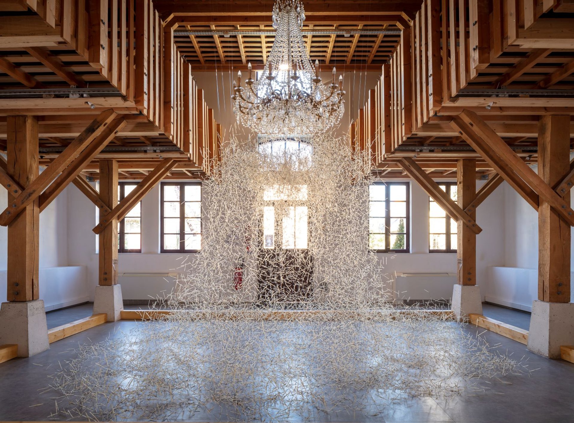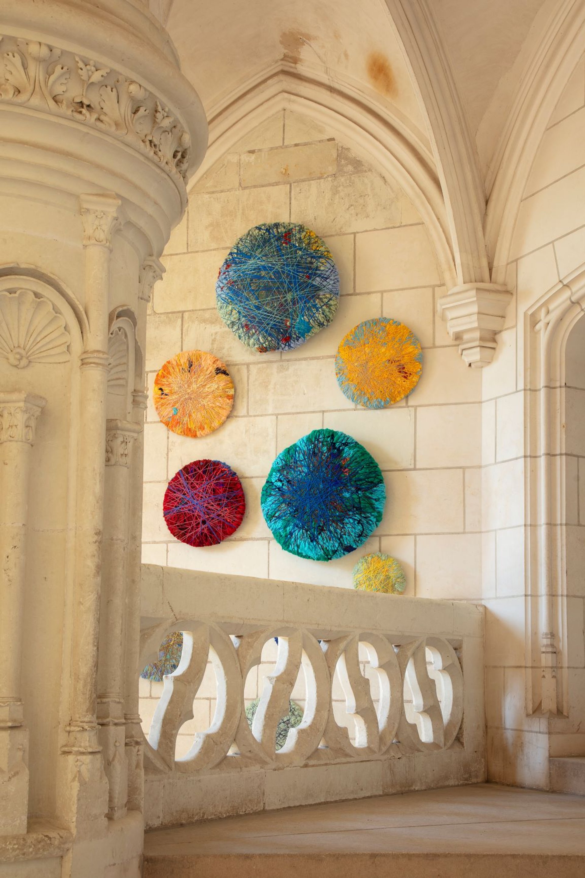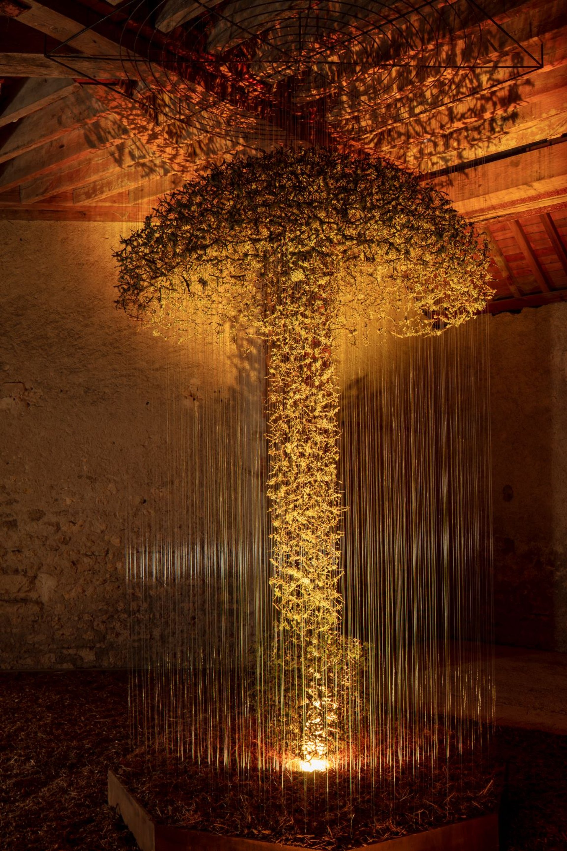 On le constate, le « fil » – au sens propre – se fait conducteur, élément constitutif de nombreuses pièces, qu’il soit de fer barbelé, de nylon ou de laine. En fils de lin et de soie, les Satellites de Sheila Hicks constellent les parois de l’escalier d’honneur du château et leurs fibres aux couleurs infinies réveillent la blancheur patinée du tuffeau. Dans la galerie basse du fenil, la pièce aérienne de Chiharu Shiota, Direction de conscience, explore les similitudes entre corps humain et nature. Constitué d’une multitude de cordelettes noires tissées en demi-cercles, l’ensemble simule les arbres tels des vaisseaux sanguins ou peut-être un neurone et sa myriade de dendrites, flottant dans l’espace comme en lévitation. Dans l’Asinerie, Carole Solvay a travaillé avec la plume d’oiseau. Au rez-de-chaussée, L’Arbre à palabres se compose d’un réseau arachnéen de calames maintenus par des fils de nylon, qui vient littéralement gober l’antique lustre à pampilles et s’anime d’imperceptibles vibrations, rais de soleil ou courants d’air.
