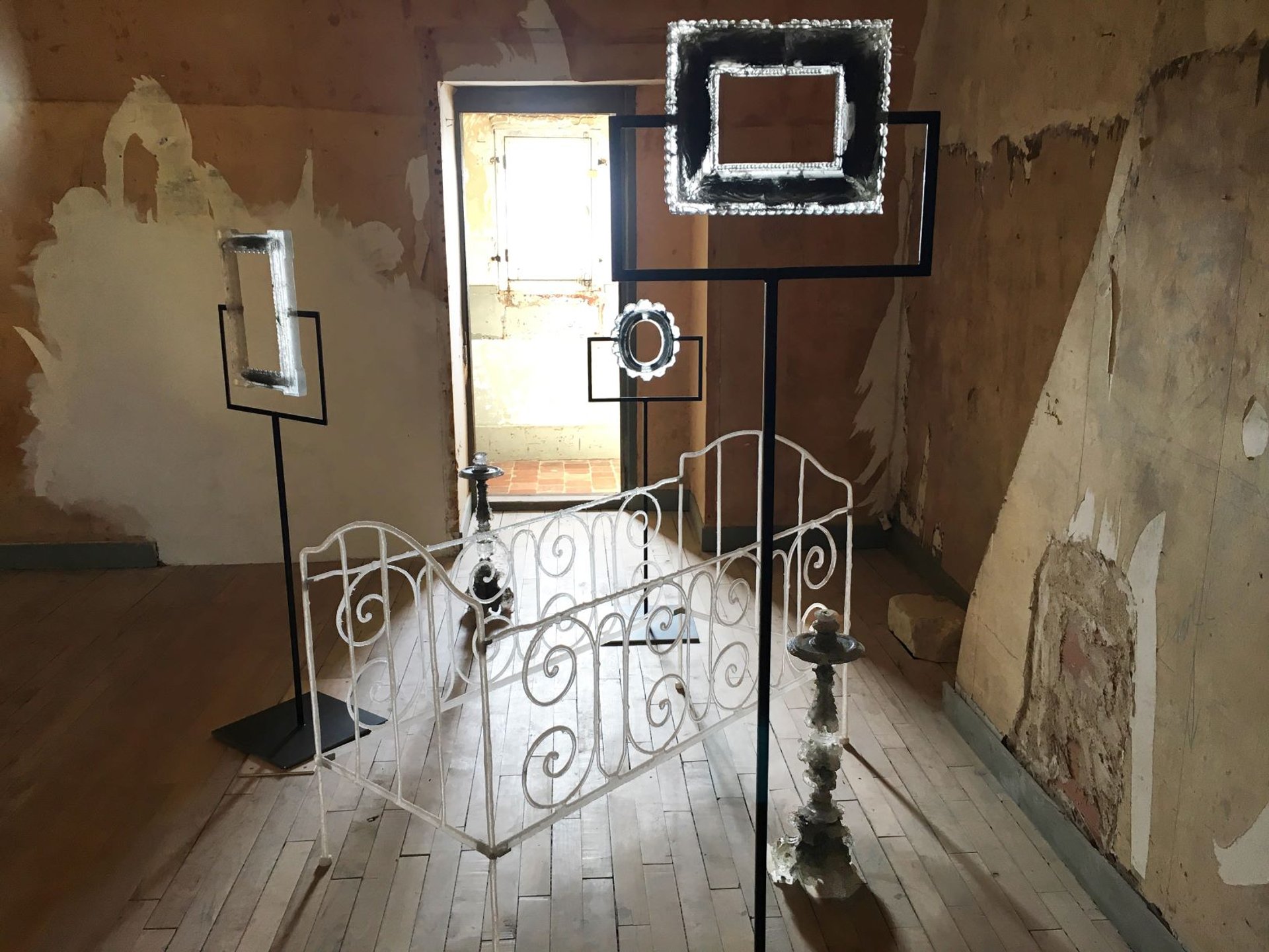 A contrario, avec les barbes de plume cette fois, Carole Solvay a conçu, à l’étage, l’œuvre Résonances, comme un négatif de la première, sorte de « nid moelleux » à l’allure de corail qui trouble l’obscurité. Dans l’appartement des invités, l’œuvre de Pascal Convert, elle, ne tient qu’à un fil. Sur un parquet branlant, on pénètre dans l’intimité d’une chambre d’enfant : un lit, deux candélabres, trois cadres, empreintes de cristaux figés dans le sable par la cuisson. De ces objets-fossiles sourd une extrême fragilité qui hésite entre nostalgie et introspection.