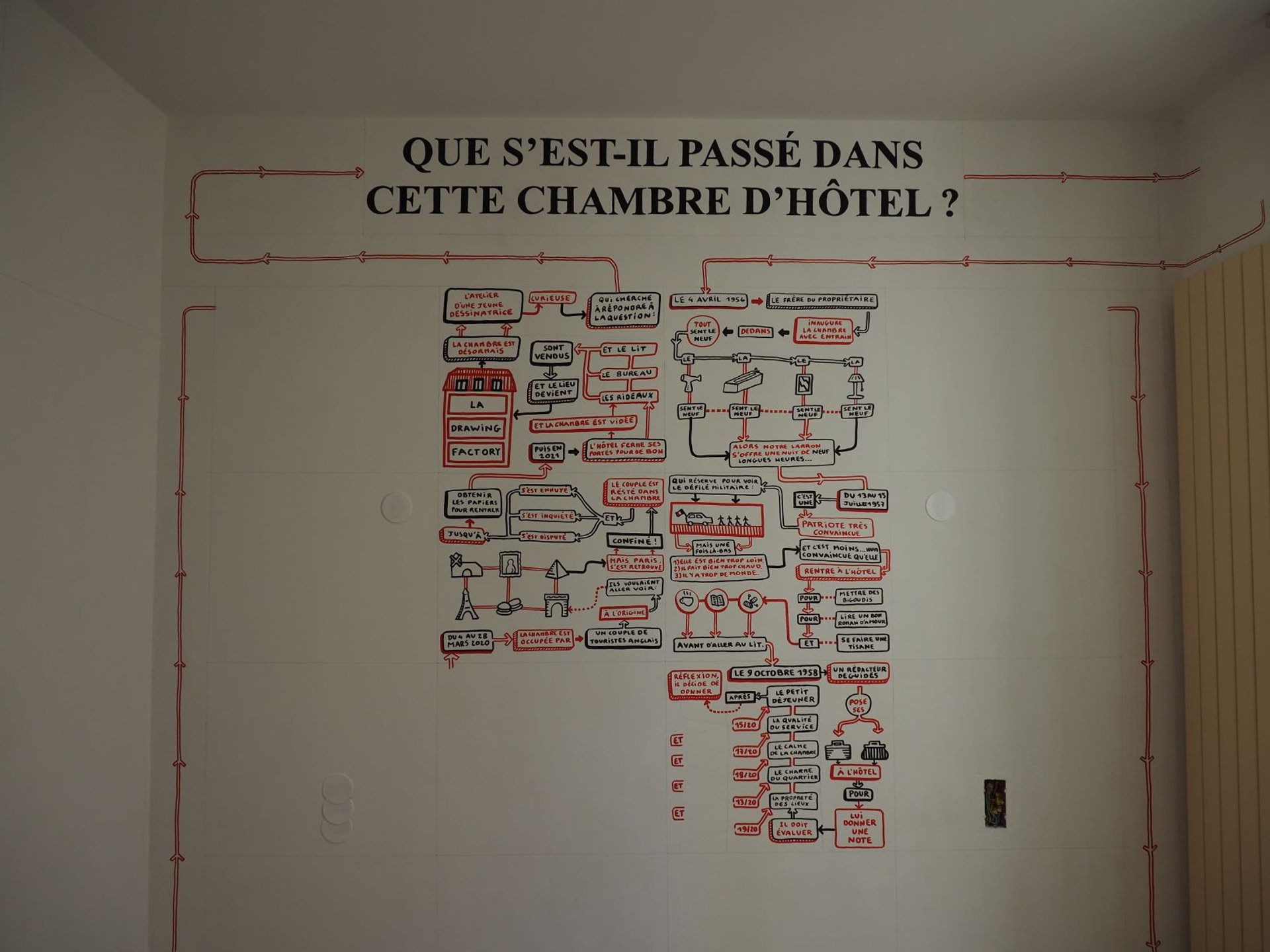 Derrière la sage façade haussmannienne du 11 avenue Mac-Mahon, dans le 17e arrondissement de Paris, rien ne laisse deviner des chambres d’hôtel envahies par des lignes et des couleurs qui débordent sur les murs, les portes et les couloirs. À quelques pas de la place de l’Étoile, cet ancien hôtel autrefois prisé par les touristes sert depuis un mois de lieu de création à trente-trois dessinateurs et dessinatrices, âgés de 26 à 50 ans. La « Drawing Factory » est la dernière initiative de l’équipe du Drawing lab, qui s’est associée au promoteur immobilier Soferim, son partenaire de longue date, et au Centre national des arts plastiques (Cnap) pour lancer cette résidence inédite prévue pour durer jusqu’au 20 septembre. «En réfléchissant à la structure du bâtiment et à ses petites cellules individuelles, nous avons immédiatement pensé à une résidence d’artistes, autour du dessin évidemment», confie Christine Phal, fondatrice du Drawing Lab (Paris) et présidente de la foire Drawing Now, qui se décrit volontiers comme une « monomaniaque » du dessin contemporain.