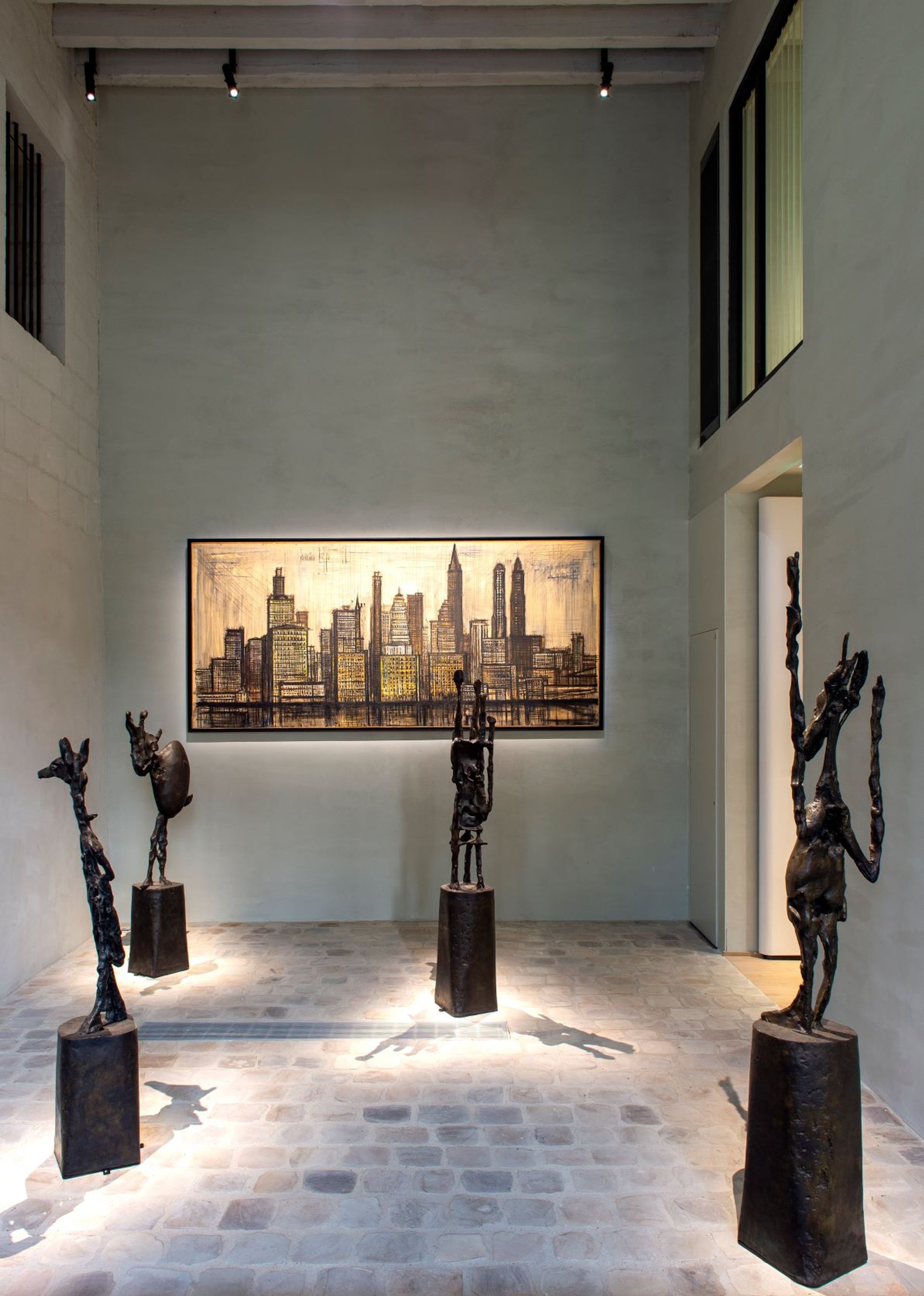 Quatre figures de L’Échiquier de Germaine Richier et New York de Bernard Buffet dans l’ancien passage cocher. © Fontevraud, le musée d’Art moderne. Photo : Marc Domage