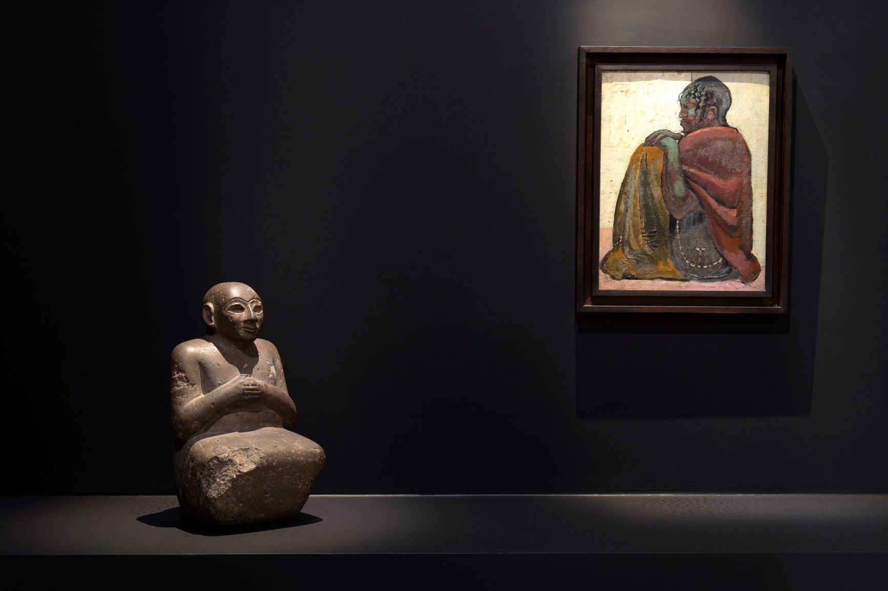 Dialogue d’objets, « Dialogue oriental » : Orant sumérien et personnage marocain de Maurice Marinot, 1917. © Fontevraud, le musée d’Art moderne. Photo : Marc Domage