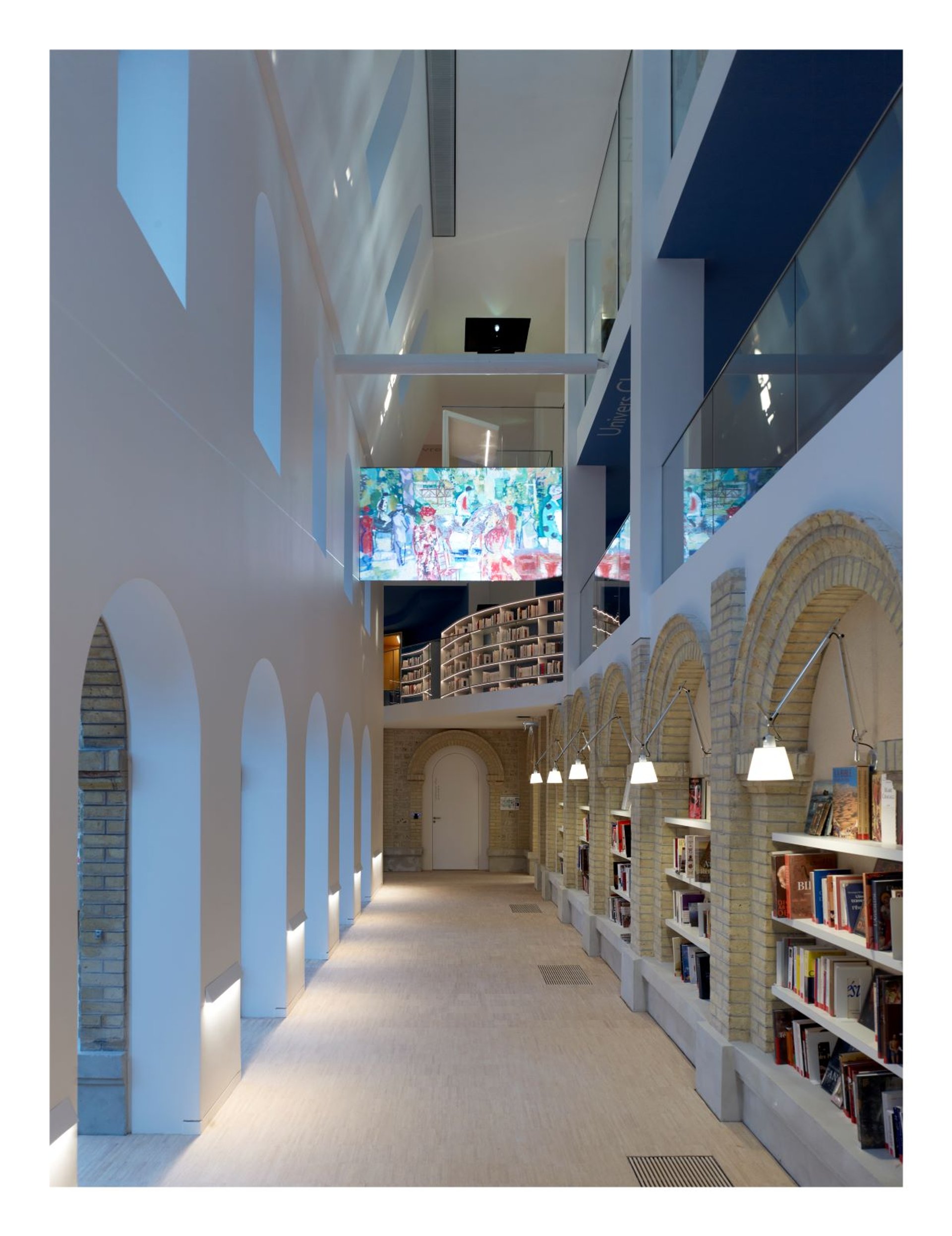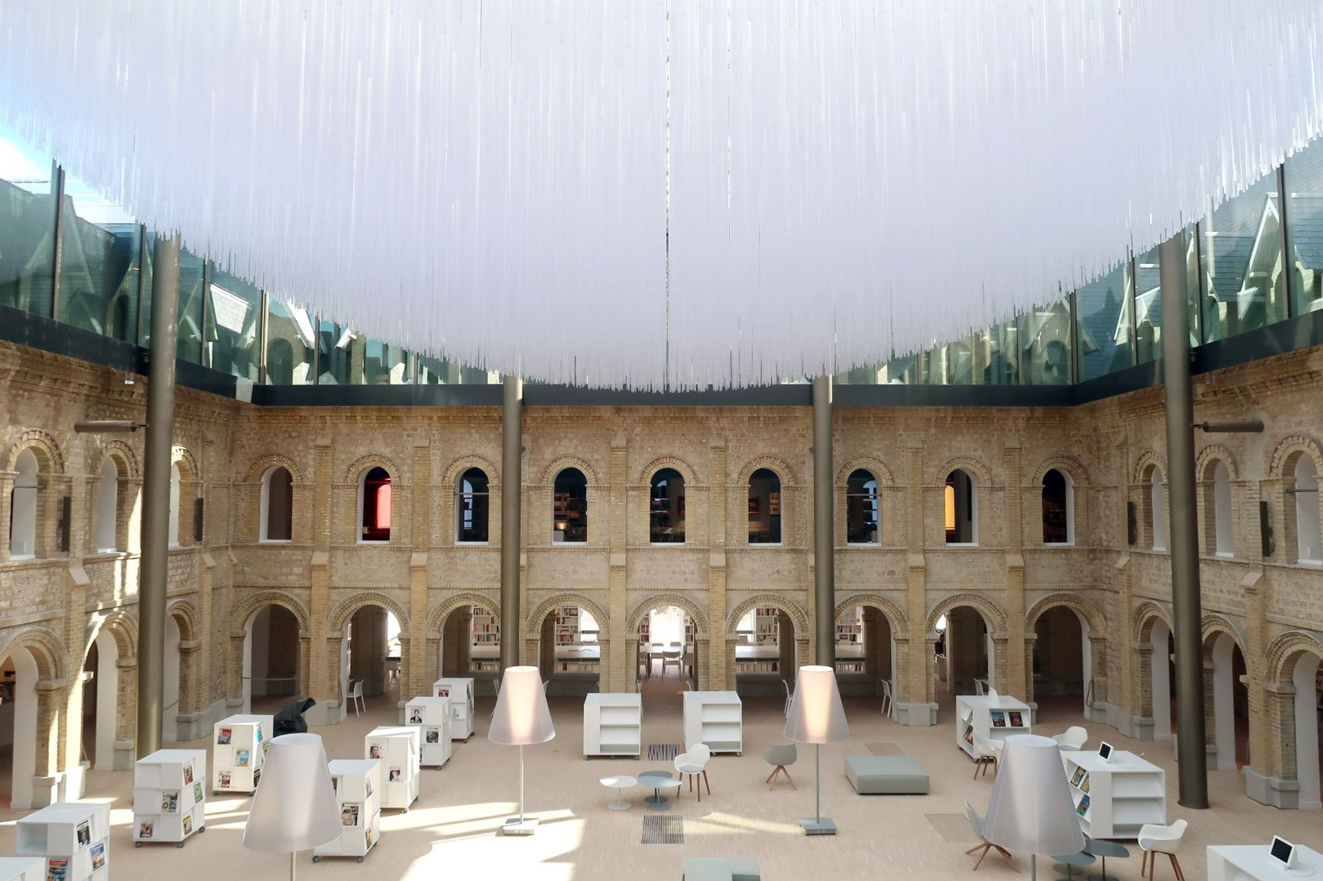 L’entrée s’effectue par la médiane qui sépare ces deux entités, laquelle conduit, à l’autre extrémité, à un large escalier qui relie les trois niveaux du bâtiment. À main gauche, l’espace des expositions arbore, en son cœur, un haut plafond surmonté d’un vaste puits de lumière. En périphérie, s’y développent aux deuxième et troisième étages les réserves. À main droite, s’affiche le cloître historique, avec ses façades à arcades faites de pierres meulières et de briques jaunes. À la fois salle de lecture et espace de rencontre, il est le nœud central de l’institution et dessert, entre autres, le restaurant ou l’ex-chapelle, métamorphosée en auditorium à gradins rétractables – 230 places assises, 600 debout.