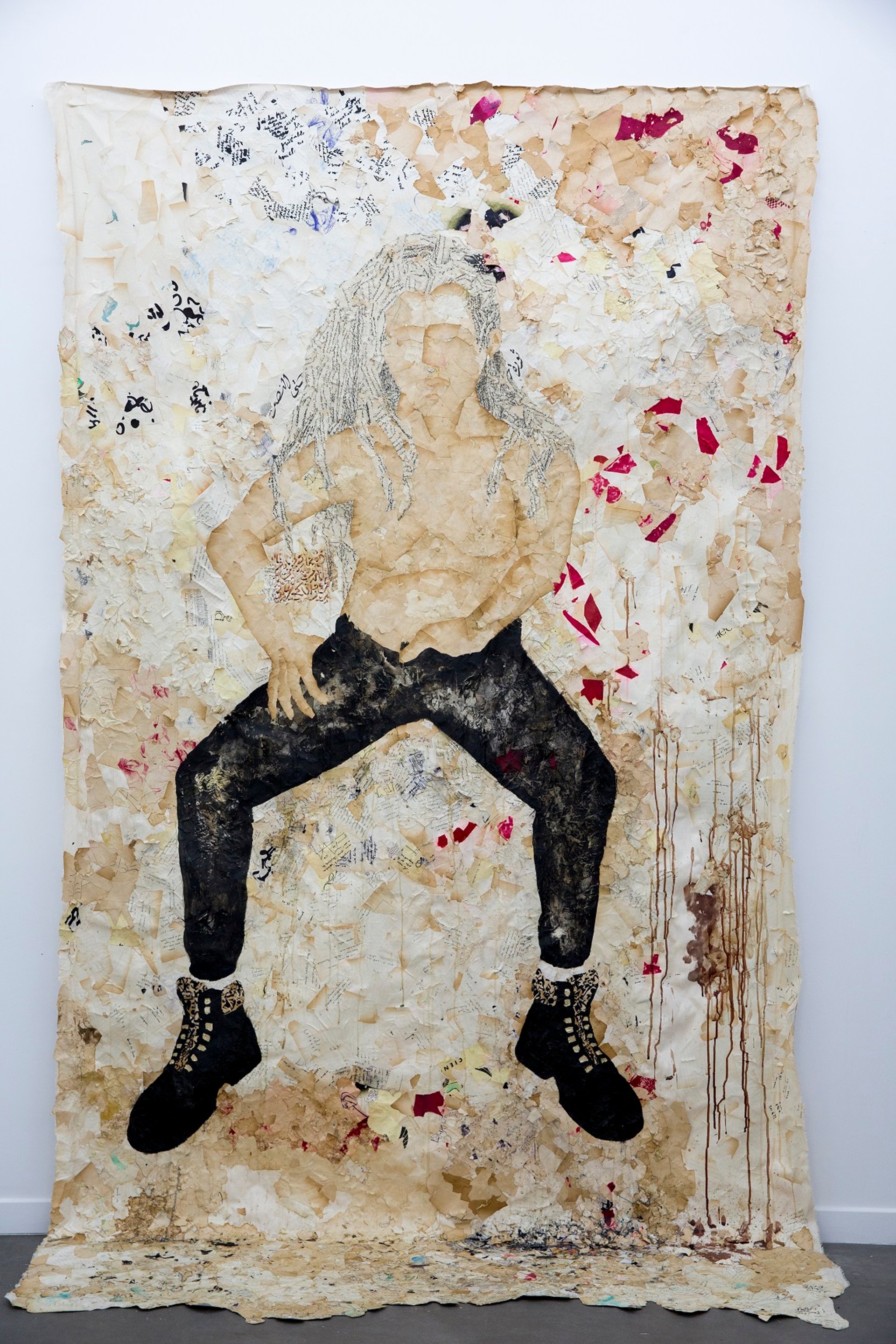 Aïcha Snoussi, Autoportrait, 2021, papier, pigments, sang et archives personnelles sur toile brute, 160 x 300 cm. Courtesy de l’artiste et Galerie La La Lande, Paris. Photo : Lionel Roche