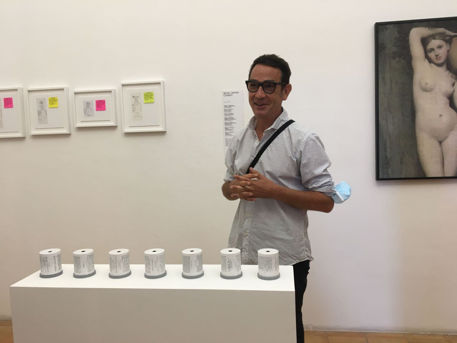 Anne-James Chaton devant sa série Rouleaux, sept grands textes littéraires imprimés sur des rouleaux de ticket de caisse. © Stéphane Renault
