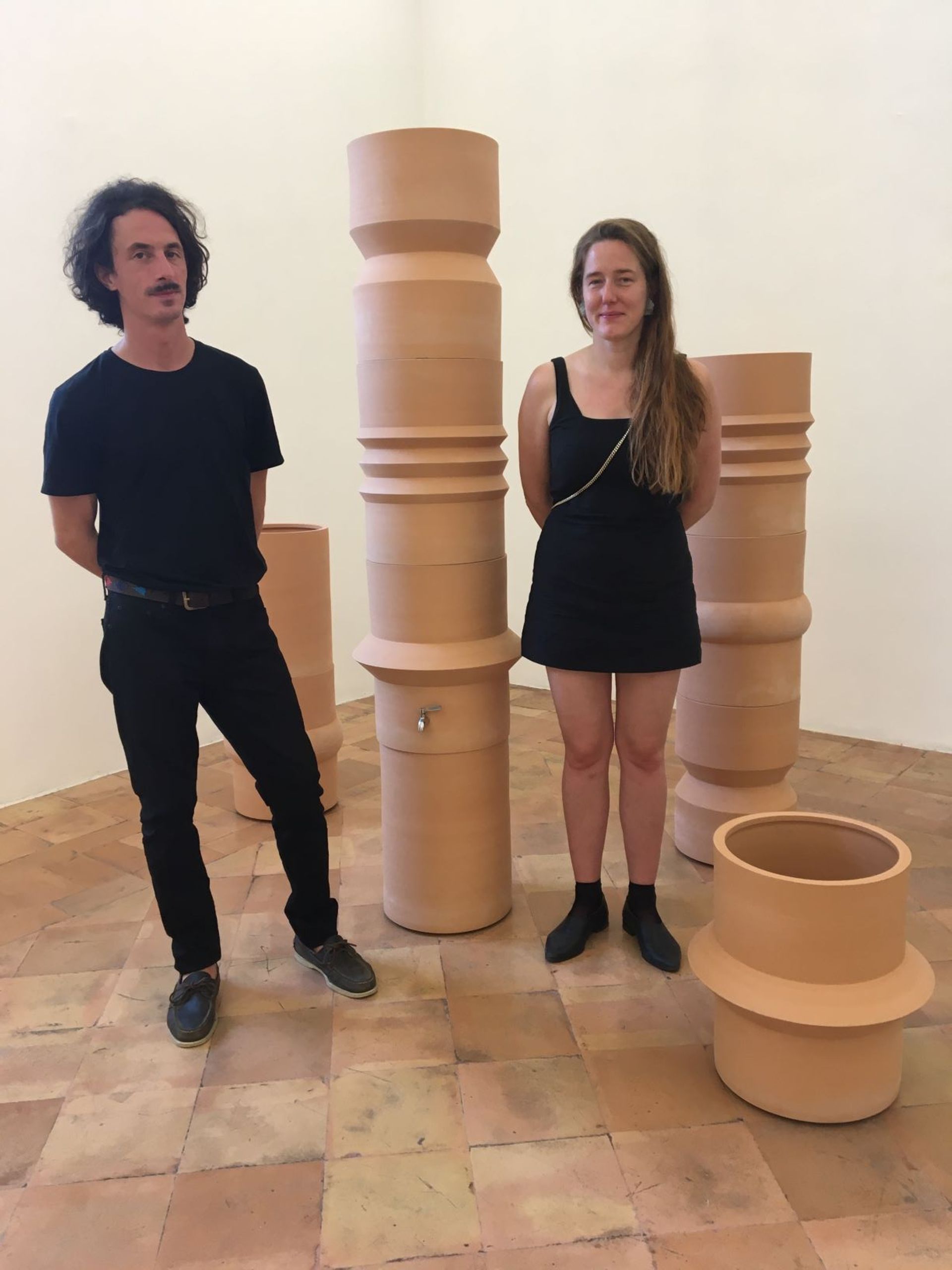 Les architectes Clément Périssé et Alice Grégoire devant leur prototype de colonne en terre cuite. © Stéphane Renault