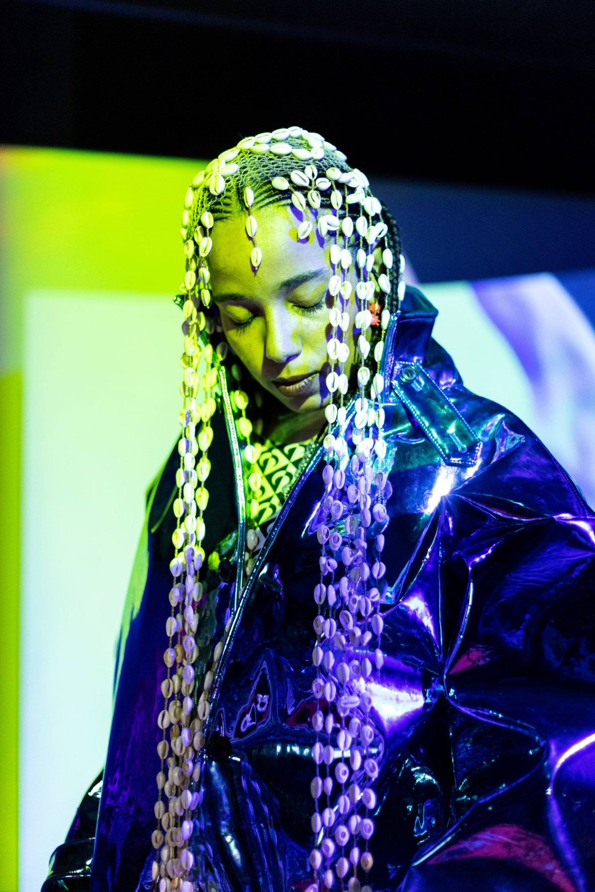 Josèfa Ntjam lors de sa performance Aquatic Invasion (2020) au Palais de Tokyo, à Paris, dans le cadre du programme de résidences « La Manutention ». Courtesy de l’artiste et Nicoletti, Londres. Photo Paul Fogiel