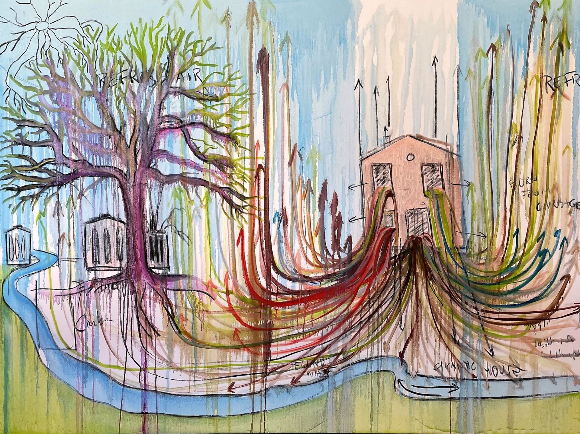 Fabrice Hyber, Quantic house, 2021, huile et charbon sur toile, 150 x 200 cm. Courtesy de l’artiste et Galerie RX