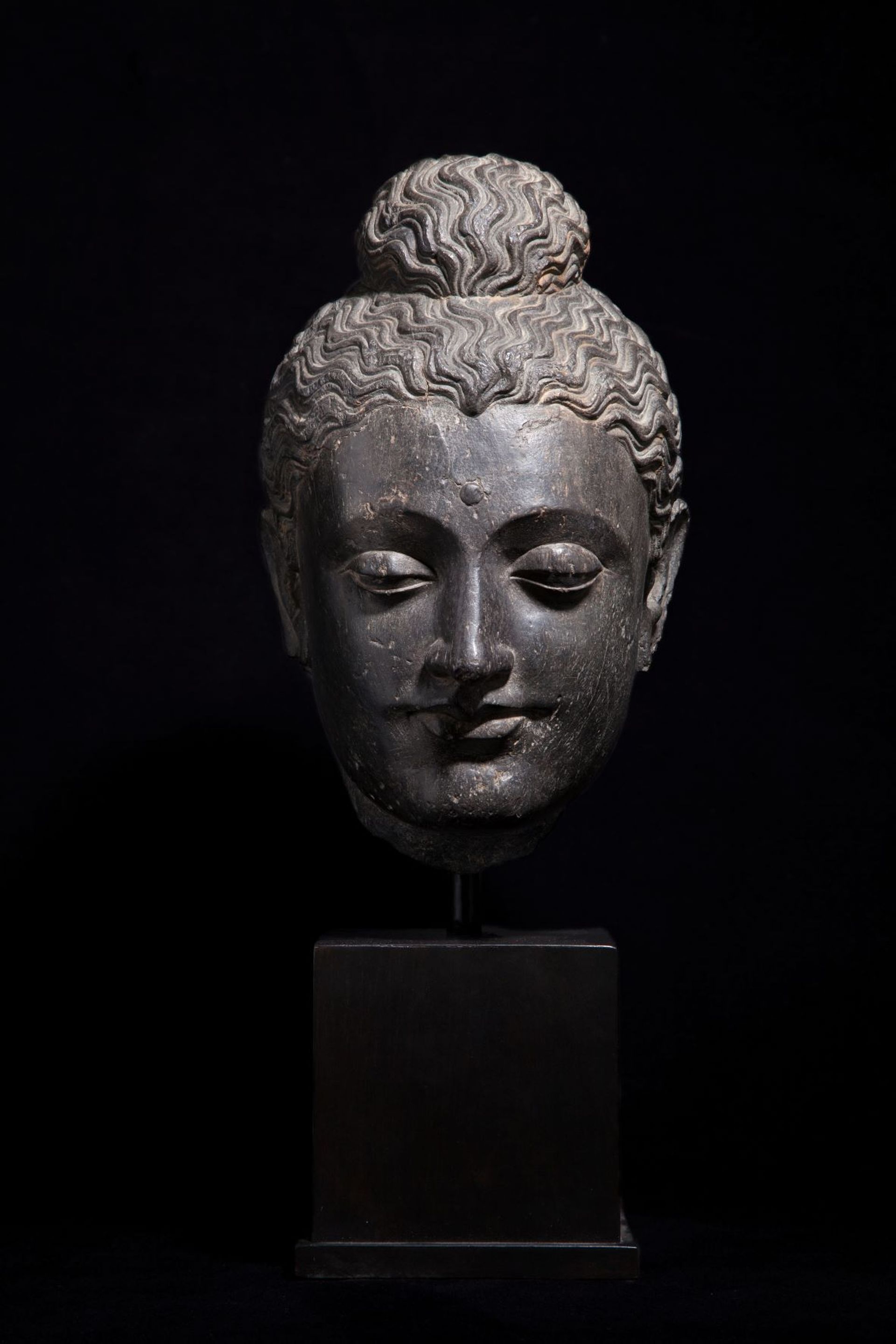 Tête de Bouddha, ancienne région du Gandhara, Pakistan, IIe-IIIe siècles, schiste. © Galerie Christophe Hioco, Paris.
