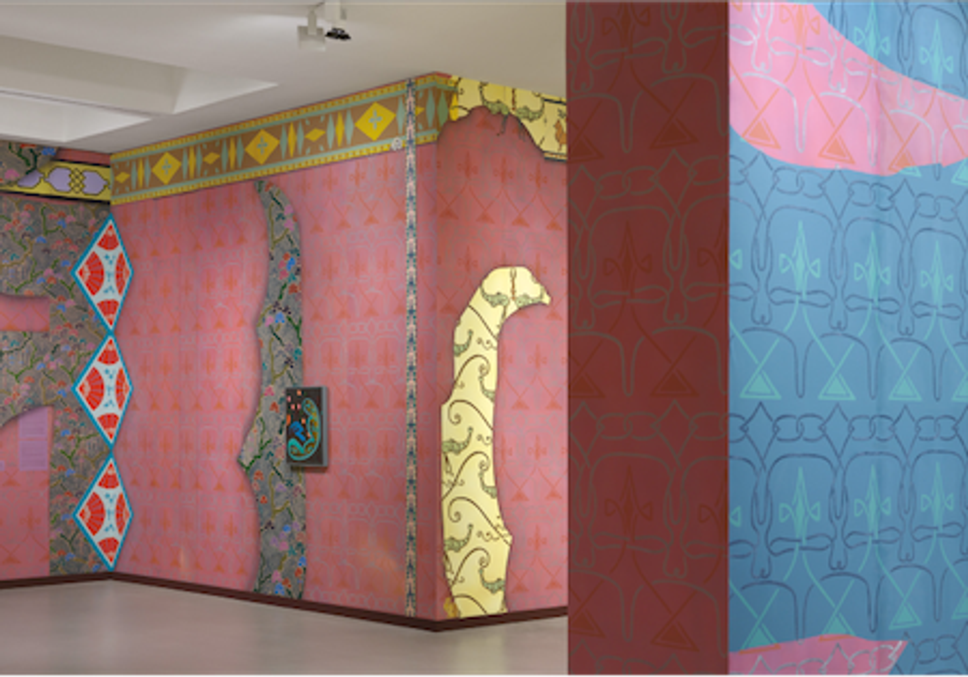 Laura Owens, Sans titre, 2021, installation murale (peinture à l’huile, peinture vinylique, acrylique, encre pour sérigraphie, aquarelle, pastel, flocage, sable coloré et transferts à l’huile de gaulthérie sur papier peint couché à l’argile avec plinthes en bois), Fondation Vincent van Gogh, Arles.