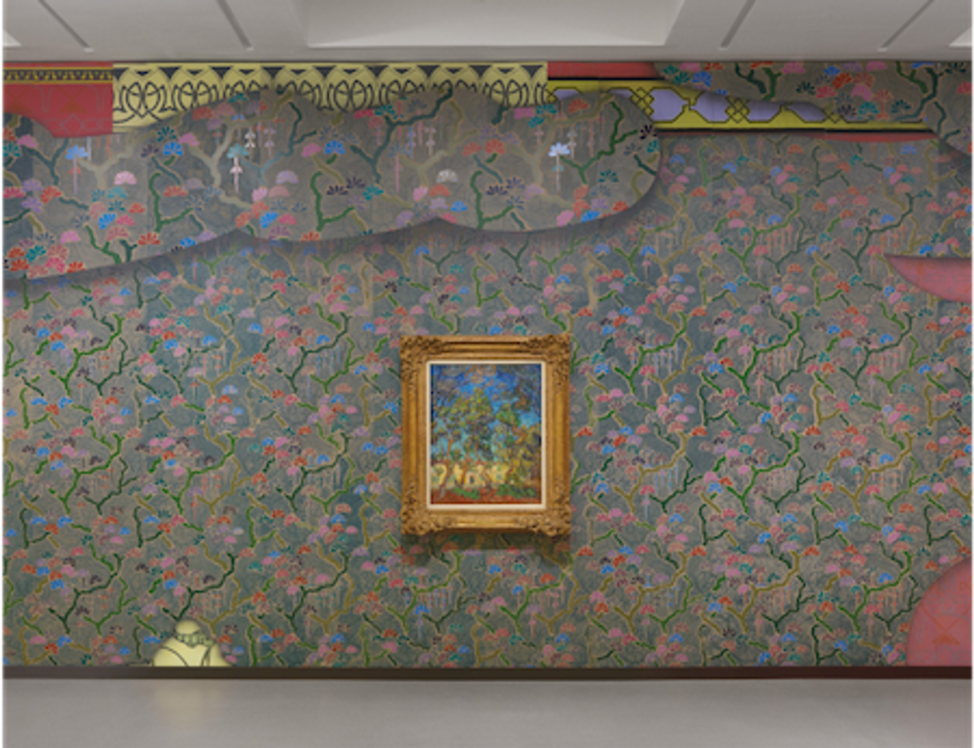 Laura Owens, Sans titre, 2021, installation murale (peinture à l’huile, peinture vinylique, acrylique, encre pour sérigraphie, aquarelle, pastel, flocage, sable coloré et transferts à l’huile de gaulthérie sur papier peint couché à l’argile avec plinthes en bois), Fondation Vincent van Gogh, Arles. Avec Vincent van Gogh, Hôpital à Saint-Rémy, 1889, huile sur toile, Hammer Museum, Los Angeles, collection Armand Hammer.