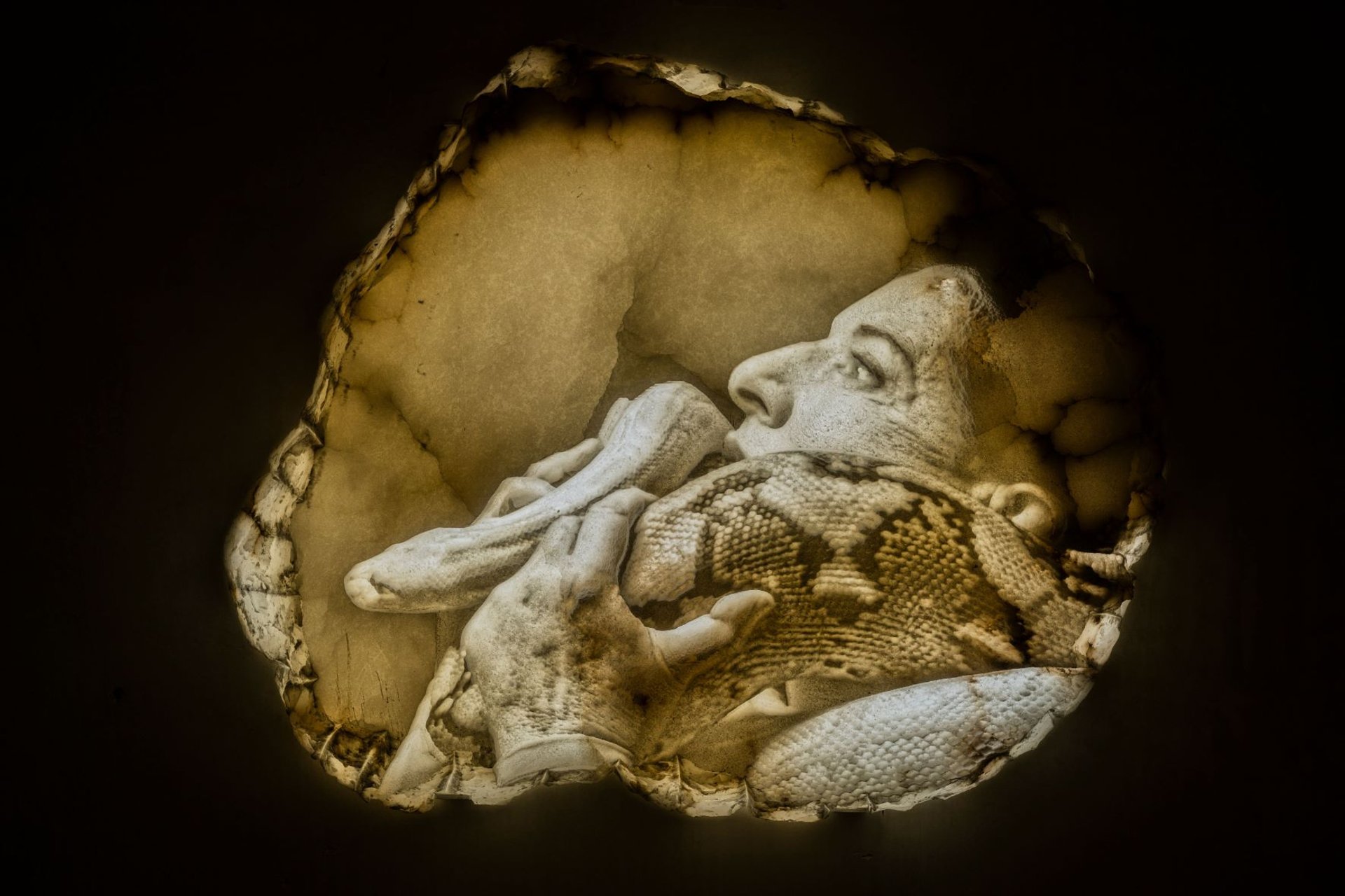 Marina Abramovic, Seven Deaths : The Snake, 2020-2021, albâtre, lumière, 105 x 85 x 12 cm. © Marina Abramovic. Courtesy Lisson Gallery and Factum Arté. Photo : Oak Taylor-Smith.