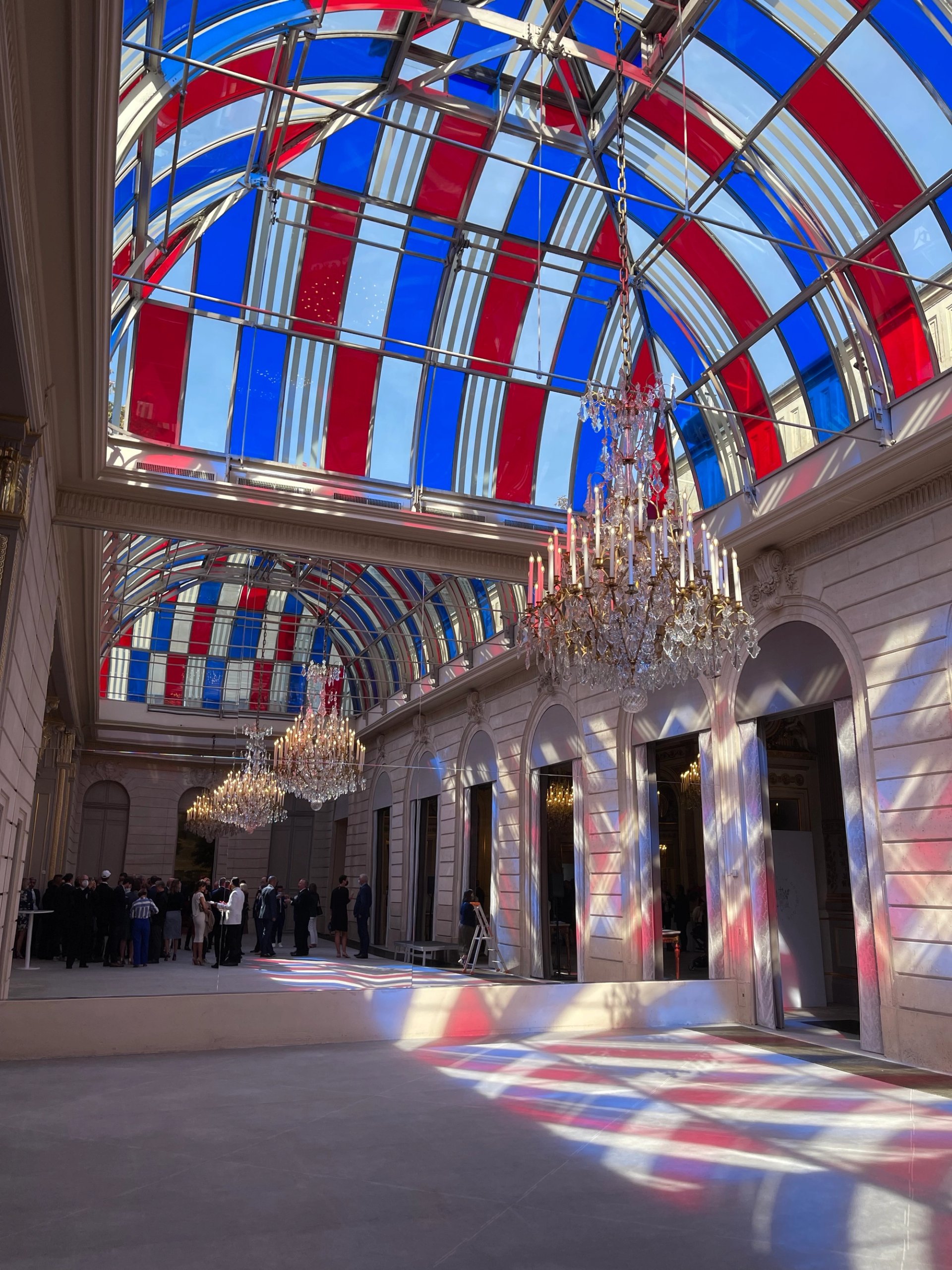 Hier, 13 septembre 2021, Emmanuel Macron a inauguré Pavoisé – travail in situ de Daniel Buren, au Jardin d’hiver du palais présidentiel. Cette pièce vient prendre place sur une verrière jusqu’ici occultée par des velums, et jouxte la salle des fêtes qui arbore depuis 2019 un nouveau décor textile aux tons plus contemporains. Sur les parois de verre, l’artiste a fait rythmer son outil visuel et les trois couleurs bleu, blanc, rouge du drapeau tricolore. Traversée par les rayons du soleil, la verrière renvoie dans tout l’espace les tons chatoyants de la France dans un ballet changeant.