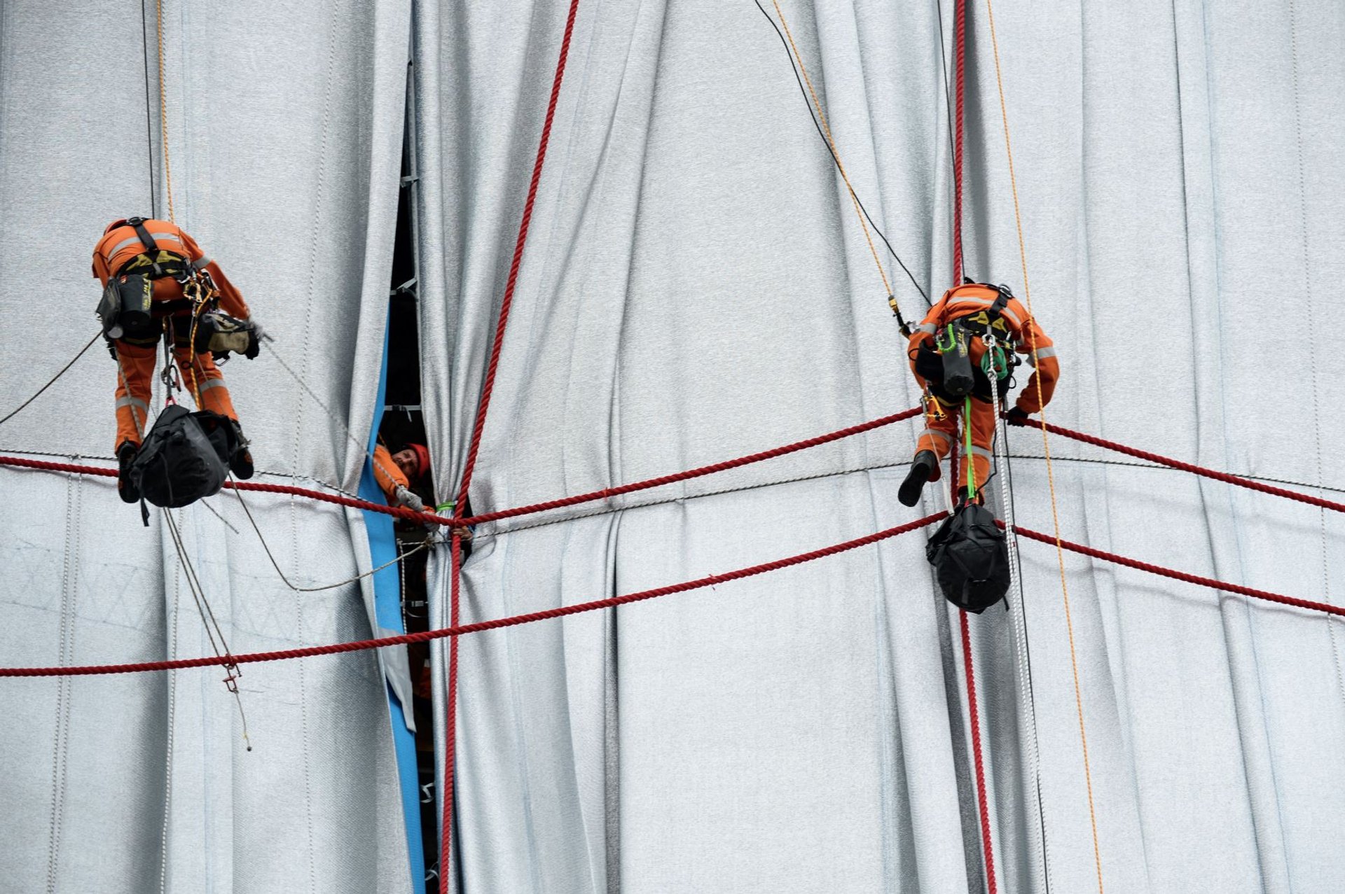 Jeudi 16 septembre, les alpinistes des Charpentiers de Paris étaient encore en train de réaliser les ultimes réglages avant l’ouverture au public, samedi 18 septembre 2021. Suspendus à leurs filins respectifs, ils reçoivent les instructions par le biais de talkies-walkies. Les cordes qu’ils disposent avec une précision extrême ressemblent à s’y méprendre aux traits rouges les figurant sur l’esquisse de Christo. L’effet est pour le moins troublant.
